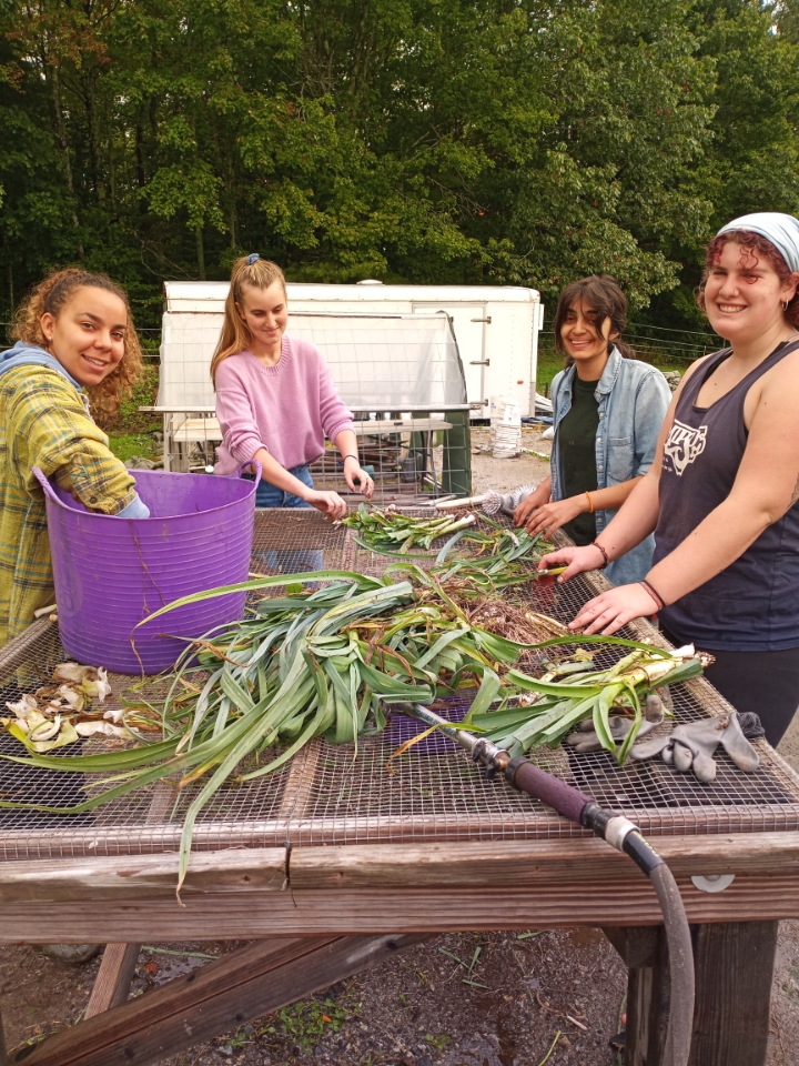 Saturday is typically a day when we get extra help. Volunteers are so generous in spending part of their weekend helping us at G2G. This weekend I got to see several special summer friends–Paul and Raizel and Riley. It amazes me that these extremely busy students find their way back to us to donate some of their precious time. Paul needed to check on his goat friends, and Raizel brought along another Colby student to help out. Here they are cleaning lots and lots of leeks with two Bowdoin students, who came to do a Saturday gleaning.