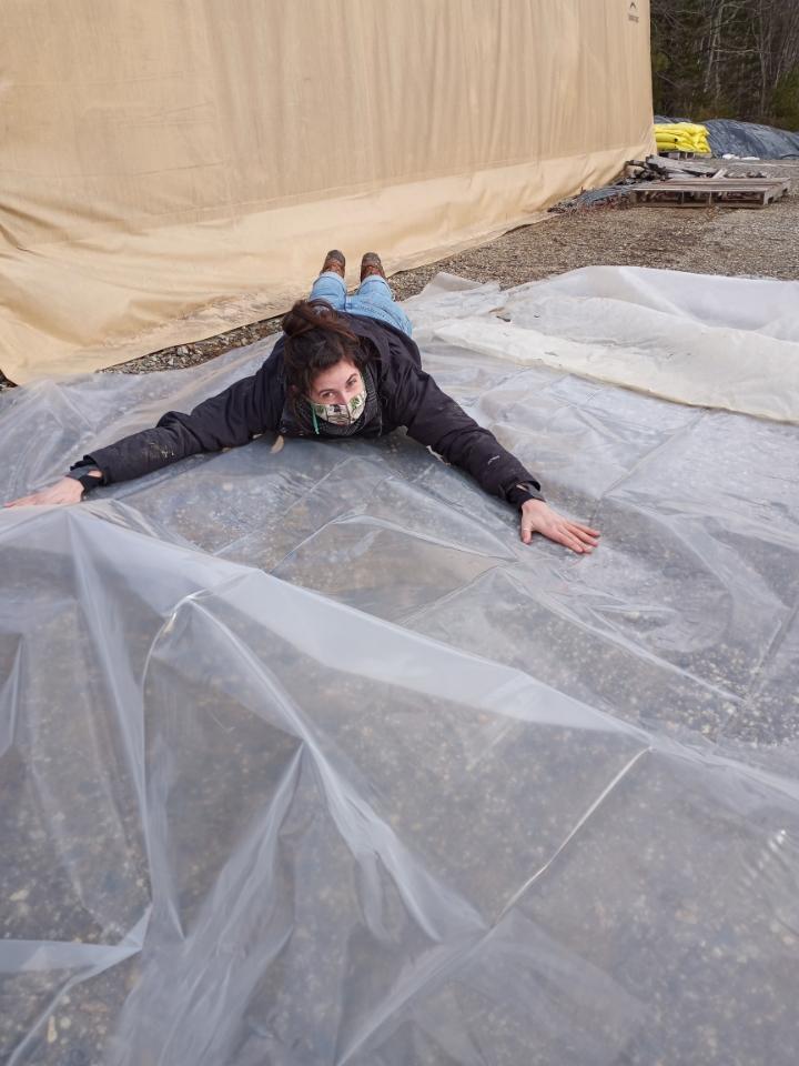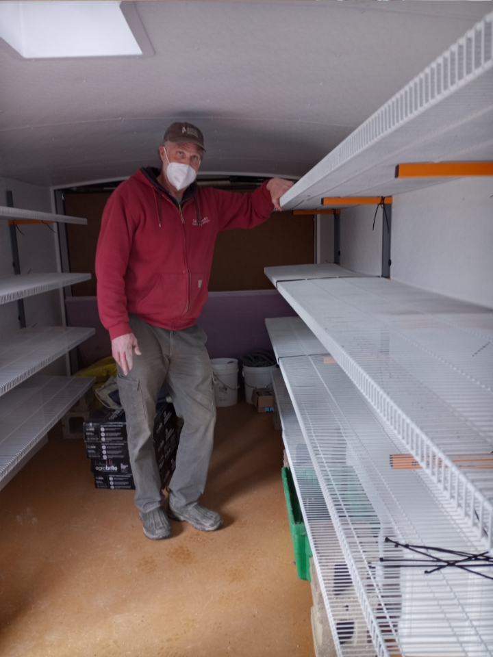 While we worked on the tunnels, John was busy with our new seedling/CoolBot trailer. He is lining the walls with shelves for seedling trays and grow lights. When warmer weather arrives this will become our produce cooler. We will be able to harvest vegetables the day before an early morning pickup and provide some of the more tender vegetables. Up until now, we couldn’t pick greens for next day distribution. This will also help us harvest on Saturdays for Monday deliveries, which will help our Monday Gleaners. Lots of our Saturday volunteers really enjoy harvesting, so this will be a nice weekend task.