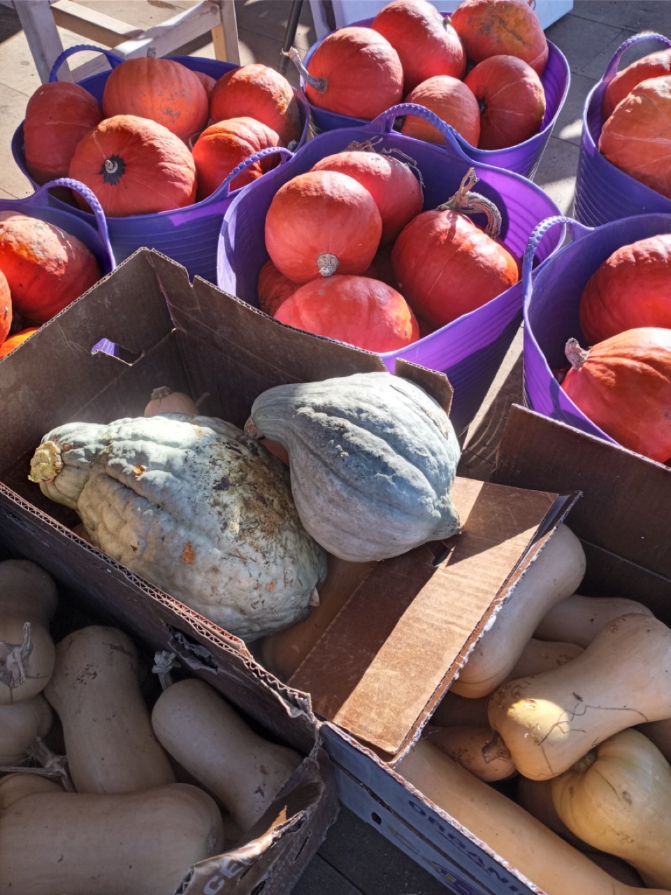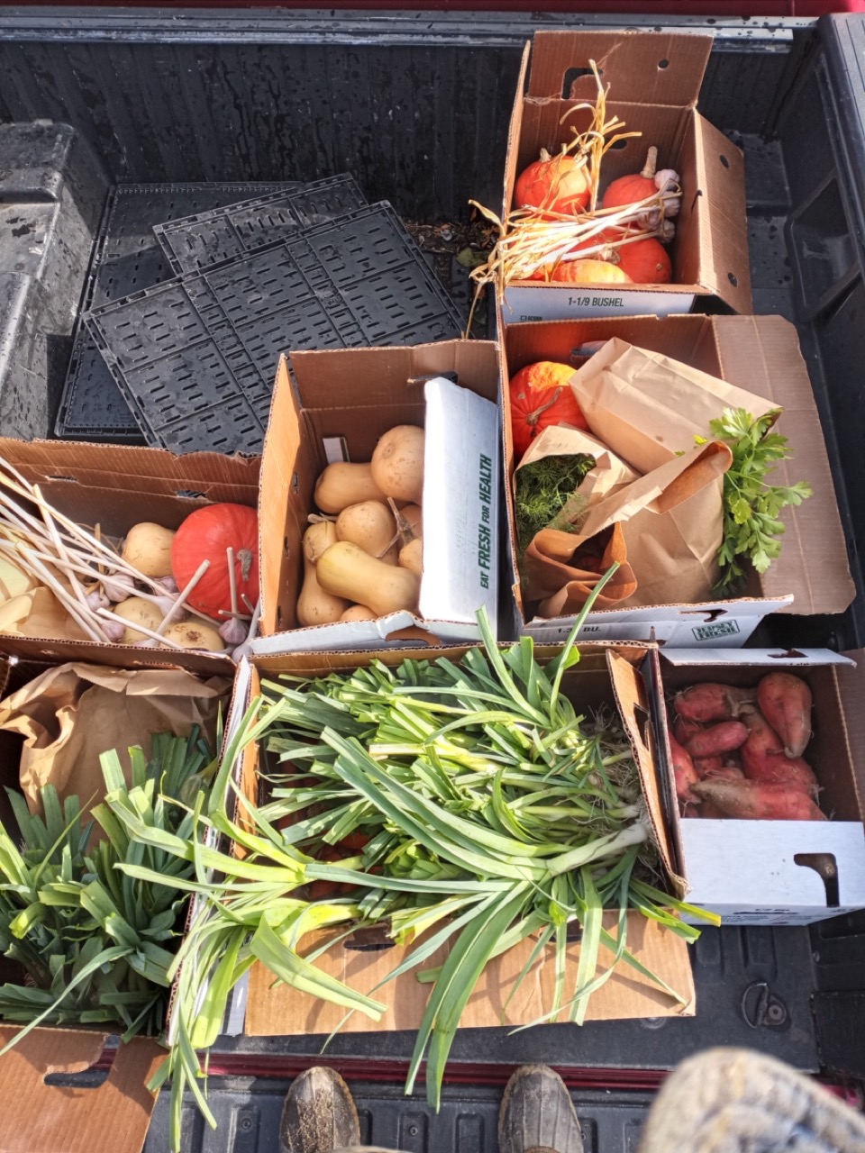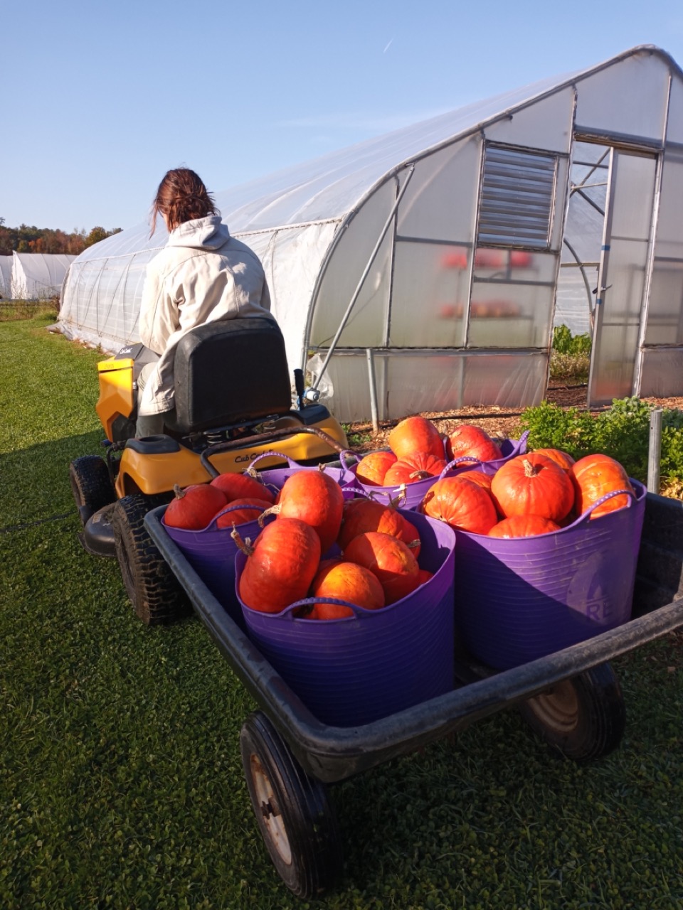 We sent out all of our cured winter squashes this week. We had lots to share–over 1,800 pounds. Genevieve chose to drive our “tractor” to move them to the packing shed where we boxed them up and sent them out. I hope our recipients enjoy the flavor of the Kabocha squash as much as we have. Taste testing is an essential part of our job. 🙂