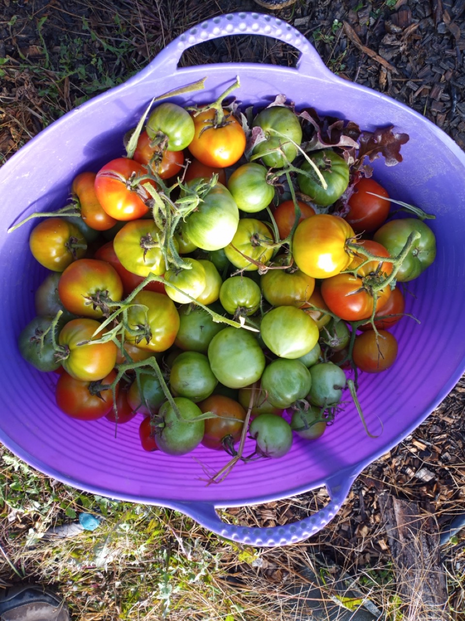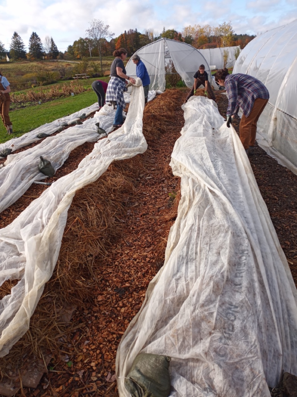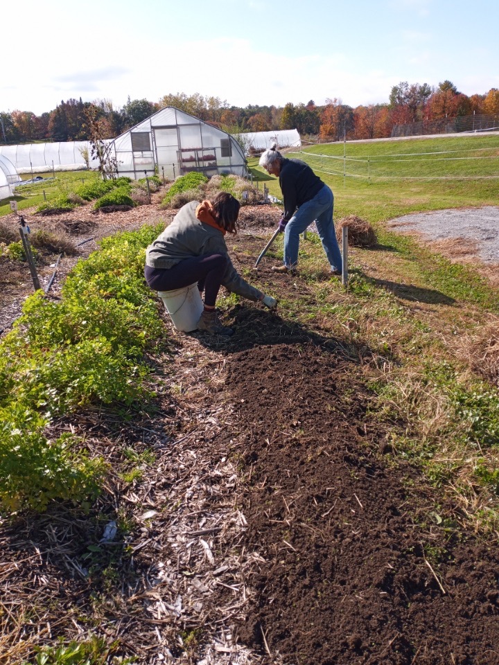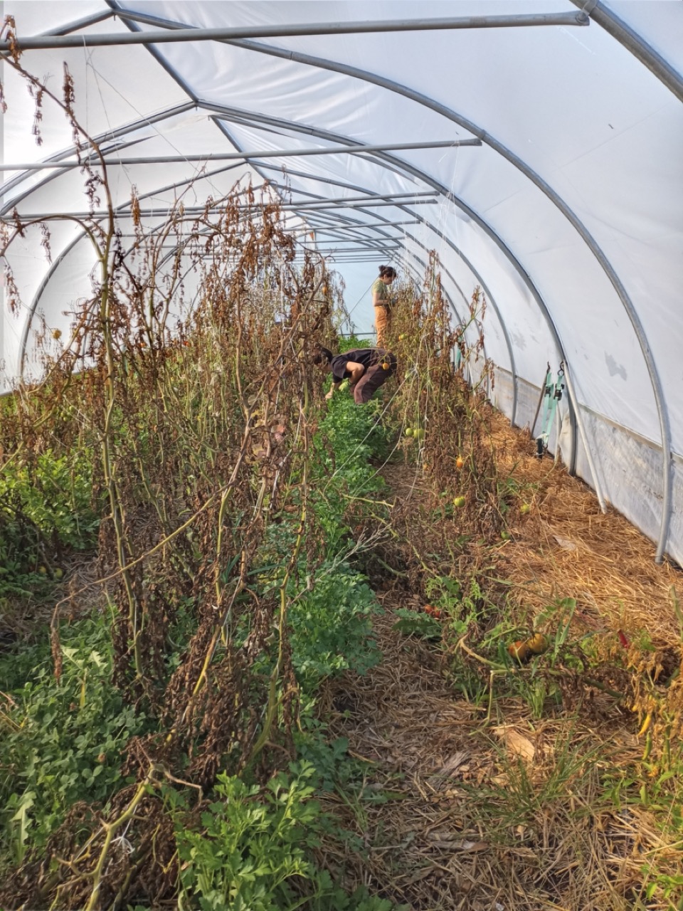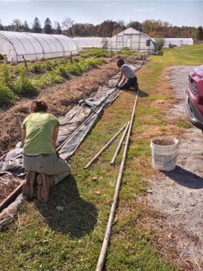 Saturday was another productive day with eleven volunteers arriving to help. They finished the lasagna project on plot 8. Thank you, Allagash, for saving and delivering all that cardboard so we were able to complete this. Yes, another pallet would be awesome! I had been saving tunnel projects for inclement weather, but with all this help, this is where we headed. All the tomato vines had to be cut down and strings dismantled. I am so sorry, Adelle, that you put your face in a spider web! We had bushels of tomatoes. 50# of them were ripe, and Genny dropped those off at MCHPP on her way home.