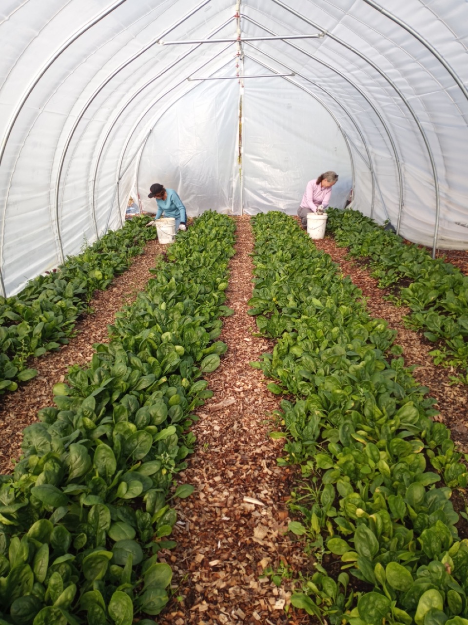Our vegetable donations are now down to just a couple more varieties. One of them is this glorious tunnel full of nutrient dense spinach. Wendi and Marsha were doing some light weeding in there on Saturday. We are waiting for the cooler temperatures to sweeten it and get it to its maximum leaf size. Maybe in another week we’ll be asking our gleaning friends to come back to help us harvest.