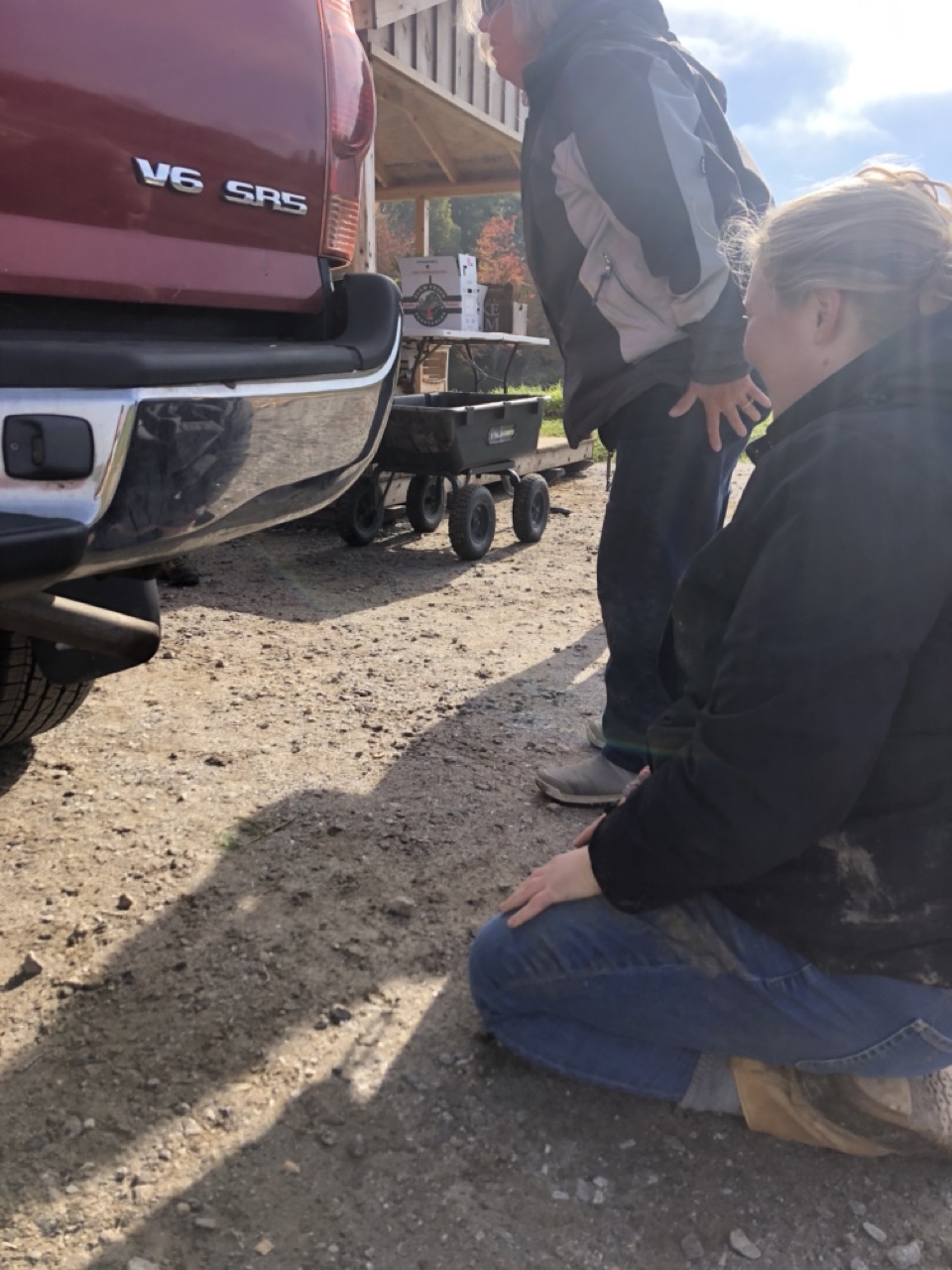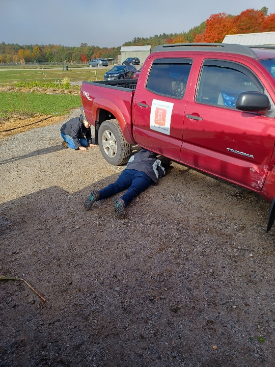 Tuesday morning, Colleen and Liza got out of their Cumberland County Food Council truck and started staring at it. “What’s up?” I asked. Apparently, the muffler had become loose. “So did you crawl under the truck to see if it could be wired back on?” “NO!” Hmmm…hence the teachable moment. “Well, you don’t want to be driving down 295 and have it fly off onto someone’s windshield and cause an accident, do you?” Another “NO!” So who crawls under the truck? One of the least mechanically inclined people on the planet, and here is the proof. Thank you, Judy, for taking this flattering photo of me! Luckily the pipe was secure enough to return the truck safely to the mechanic for a replacement. All in a day’s work at G2G!