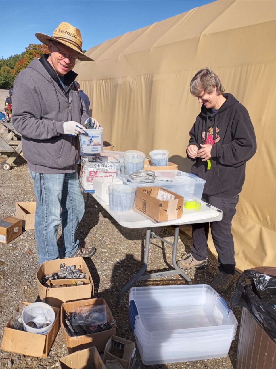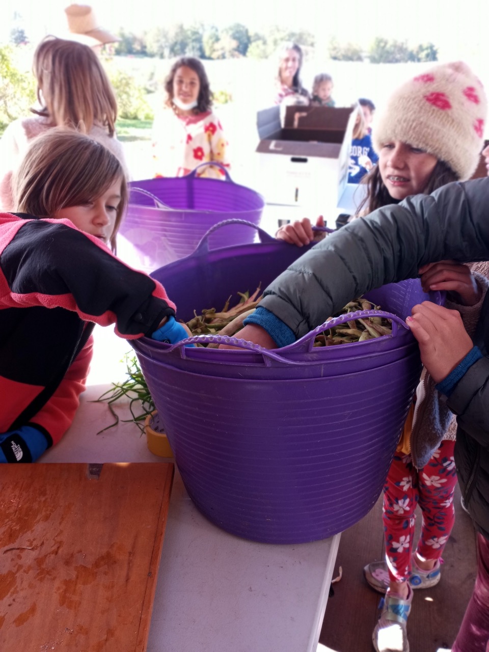 So, John was moving gravel on Friday, bouquets were being made, children were harvesting shell beans to be delivered, the volunteers were working on the butternut squash, the Gleaners were gleaning, and the Fix-It Team was doing me a big favor. Bob hurried out to the tunnels with his drill to make life easier for us, and the rest of the Fixers got stuck with a not-so-fun project. I learned later from a little birdie that one Fixer did not come last week thinking that I would ask them to work on this project, and another Fixer had just spent the day before in his own garage doing this very thing. So I apologize to all of you. Helping to organize the many buckets and boxes of “STUFF” was so necessary to be ready for next week’s big move! Funny how Burnham, John Hayes, and Tom were all away last Friday?