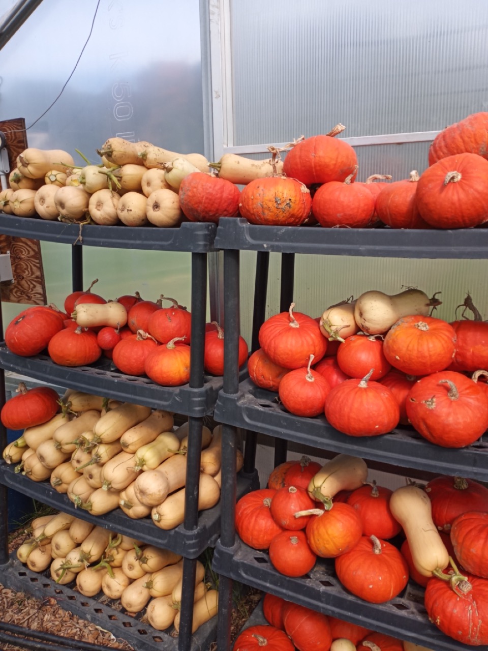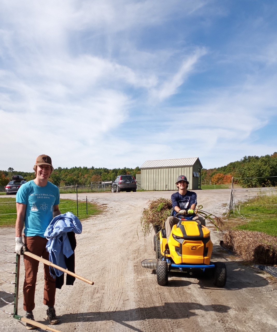 Top priority was the gleaning. We had a light frost, so it is now important to harvest anything that would be damaged by the next one. All the butternut needed to be pulled, cleaned, and stored. Then facing the weedy mess that was left behind, there was a lot that needed to be dealt with. We thought it would be a good idea to top dress a couple of plots with some local horse manure last Fall. Unfortunately, the manure came with so many weed seeds that just loved all that extra nitrogen! Since we were planting Winter squash there, it was a low weeding priority this past Summer. That became a huge weeding problem this Fall. This plot had to be abandoned, and the squash left to grow amongst the, I will call it, living weed mulch! Luckily Ayden and James came on Friday to volunteer and headed up to tackle the clean up. When I mentioned driving our yellow electric tractor as part of the plan, I got huge smiles. This is a cheap trick I often use–mention driving the tractor and all of a sudden the project just gets a lot more fun!