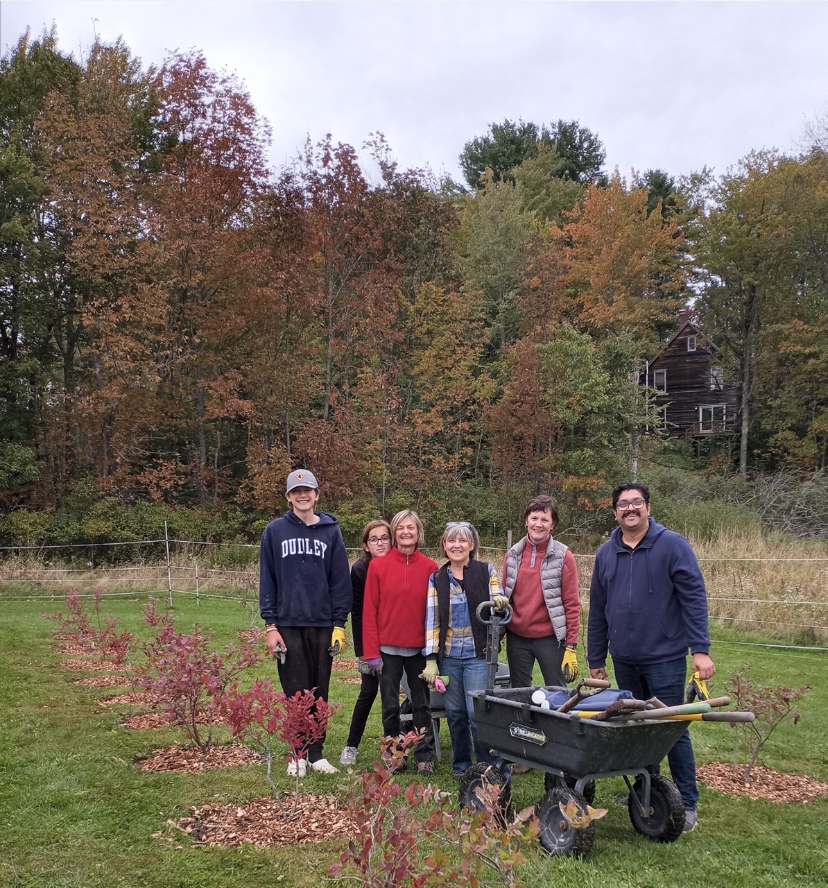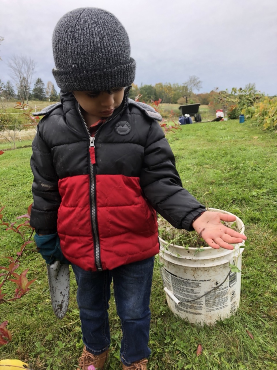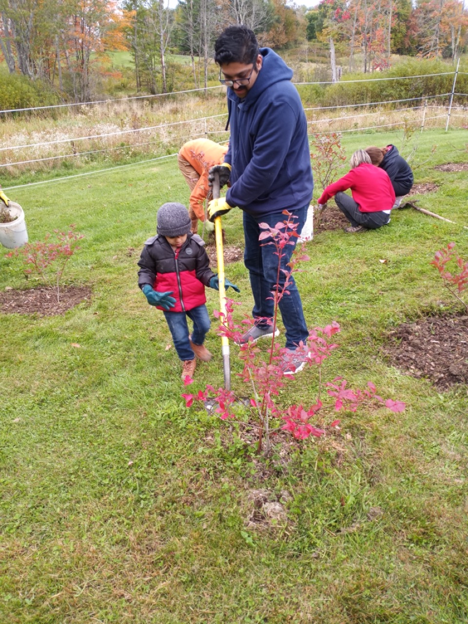 A group of volunteers from MCHPP also came to help us, and they helped put our blueberry orchard to bed. Even the littlest volunteer got in some determined shoveling with a bit of help from his dad.