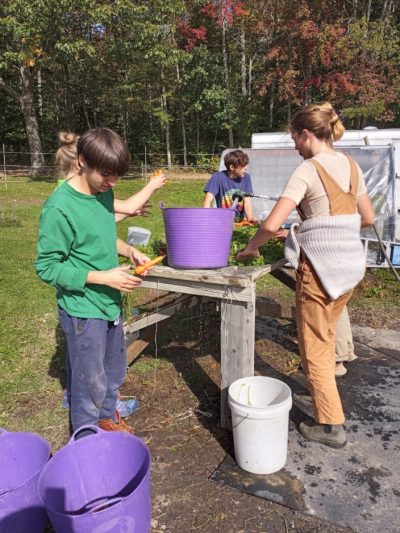 On Tuesday afternoon, we had a fun group of 9 high schoolers from the Maine Coast Waldorf School. We appreciate all the support we get from the Waldorf students and teachers. They always get so much accomplished. This group was exceptional in tackling the projects on my list. Harvesting and cleaning bushels of carrots for the Wednesday gleaning was one project. Carrots are always fun to dig up, like buried treasures, everyone was trying to find the biggest one. Luckily they had time to wash them, take the tops off, and pack them up for Wednesday’s deliveries. Enough time for one more task–taking down the cucumber vines and harvesting the rest of the cucumbers in the Rimol greenhouse.