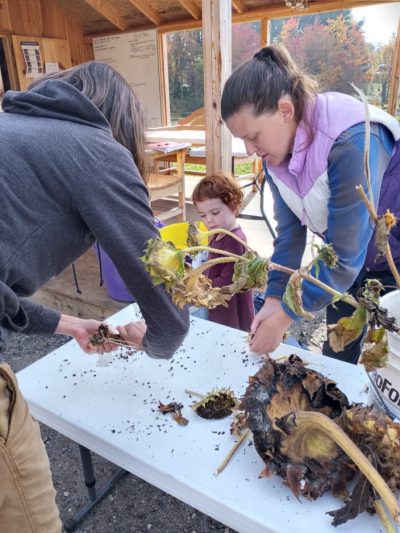 Then Harpswell Coastal Academy arrived to volunteer and observe our methods for application at their school gardens. Carrie has been working with them and has gone to their campus to see what their needs are. They jumped in and removed all the shell bean plants that the frost took out.