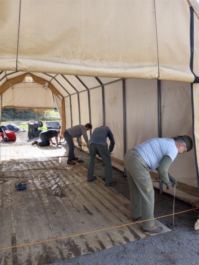 Friday was absolutely gorgeous! The maple trees at the farm were on fire. Everyone was stopping at the top of the driveway to take it in. While Vera helped Carrie and her mom save seeds for next year, the Fix-It Team was busy. We had put a call out for extra help to prep the tan shed for relocation. We had it all cleared out so they could pull up the flooring, the tarp, and pull out the anchors. Meanwhile, Vera was using her broomcorn swag to help us by cleaning up the tool shed. The tan shed was quickly settled on its new foundation, and the shelving was put back in place. We have now started to organize and sort through the contents for better accessibility.