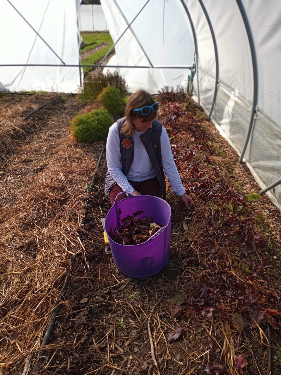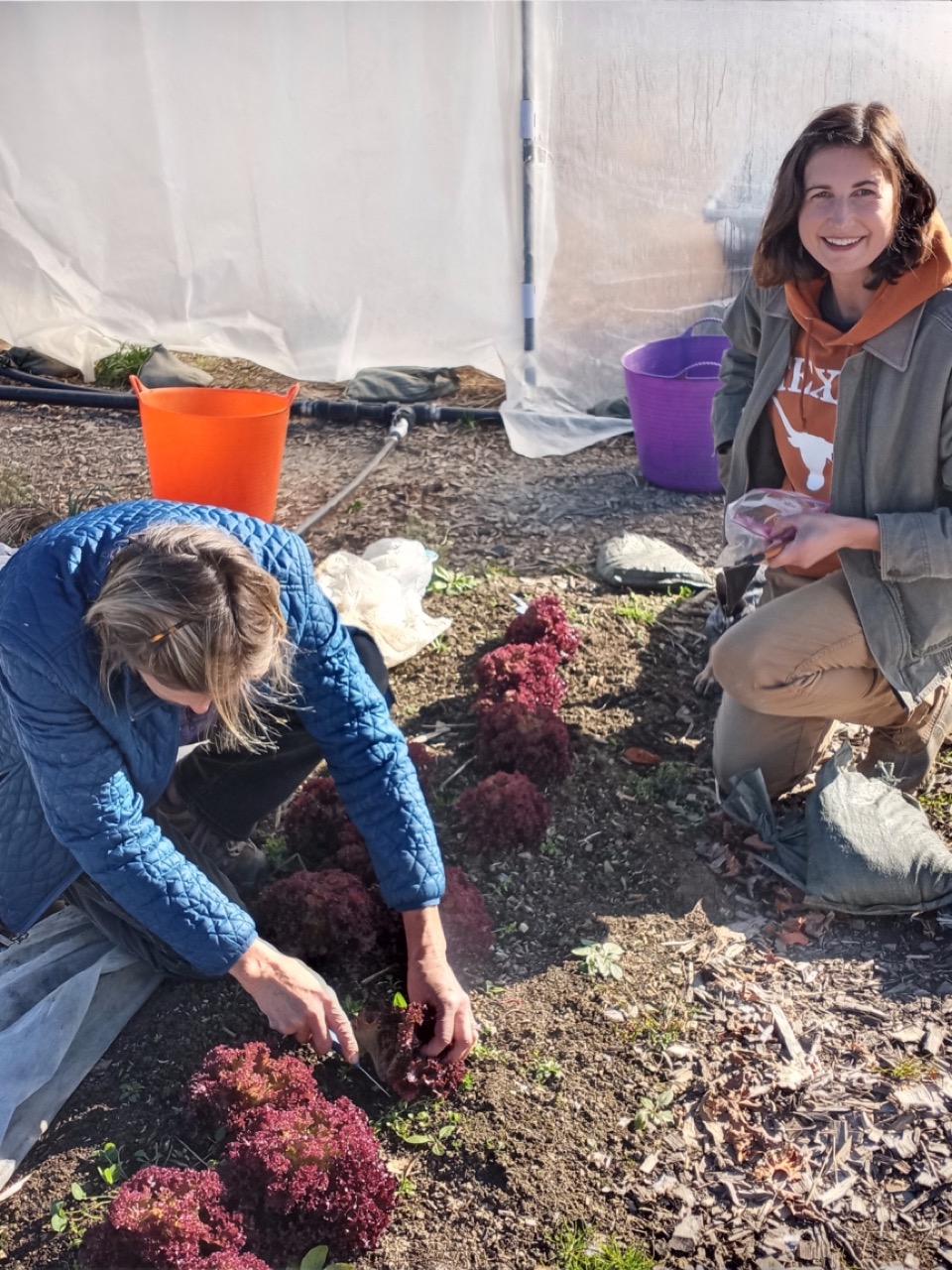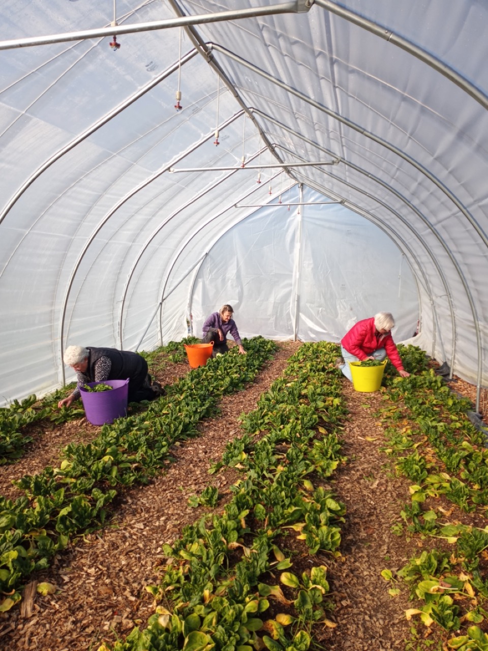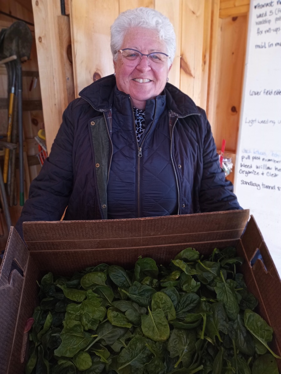 Rarely do Carol Gillespie or Deirdra miss an opportunity to volunteer with us. The lettuces were small, but beautiful, and then there’s that spinach tunnel that just keeps on producing.