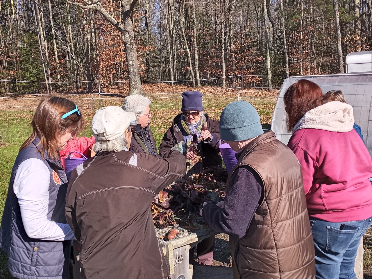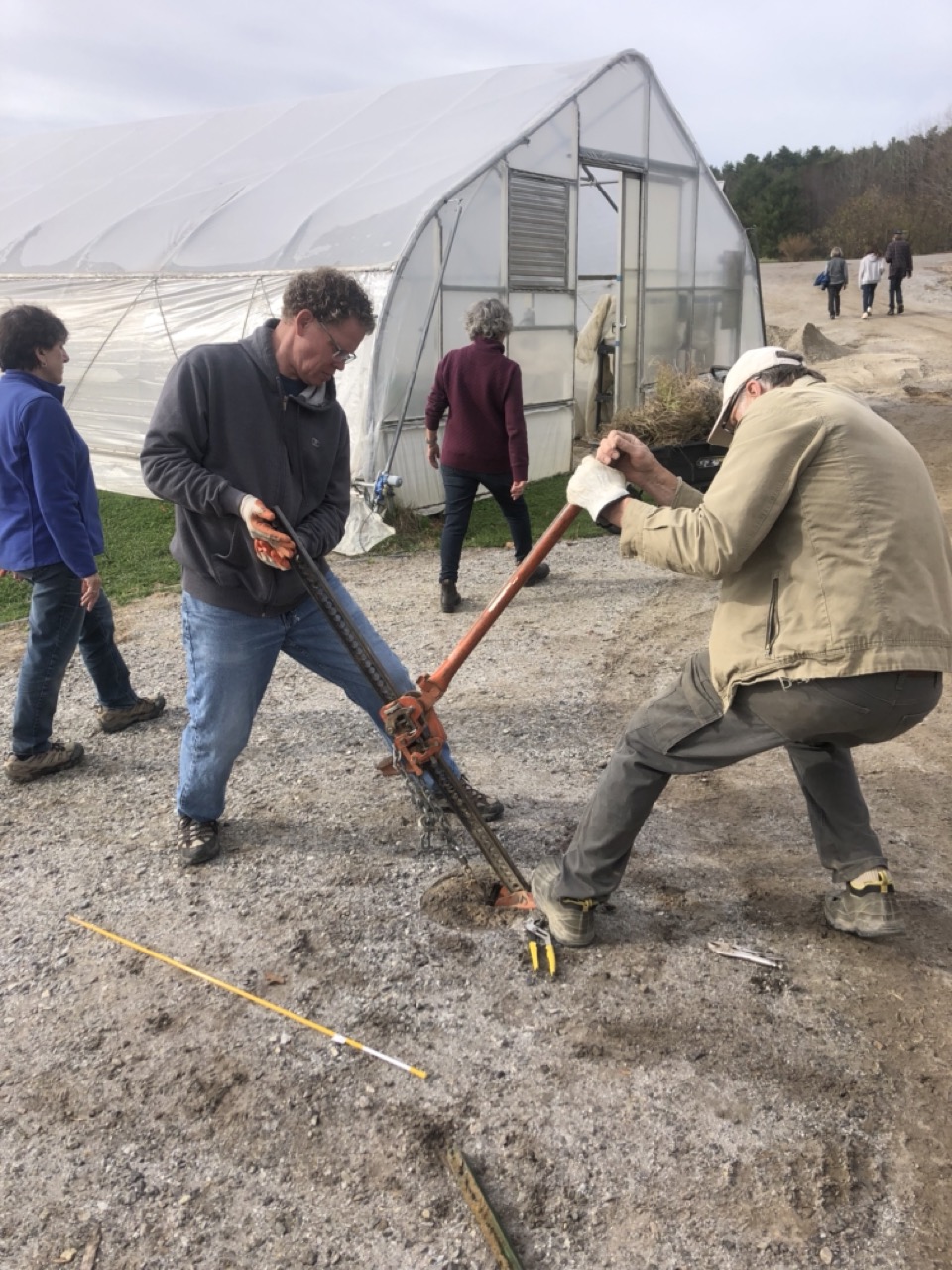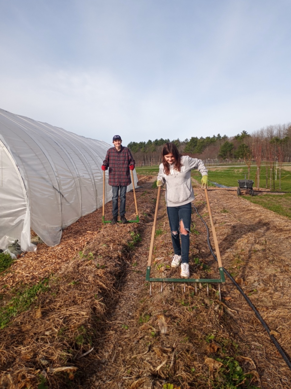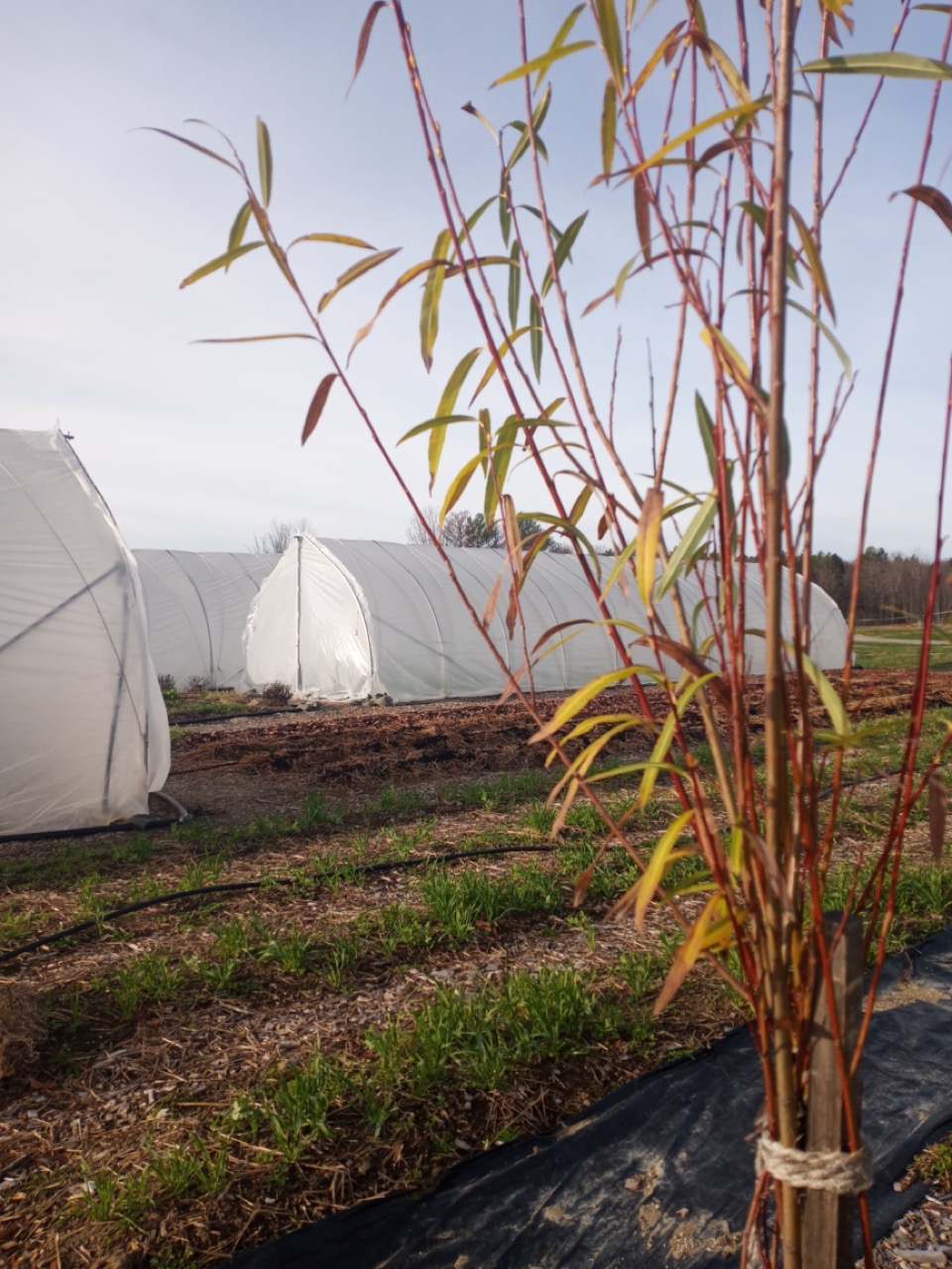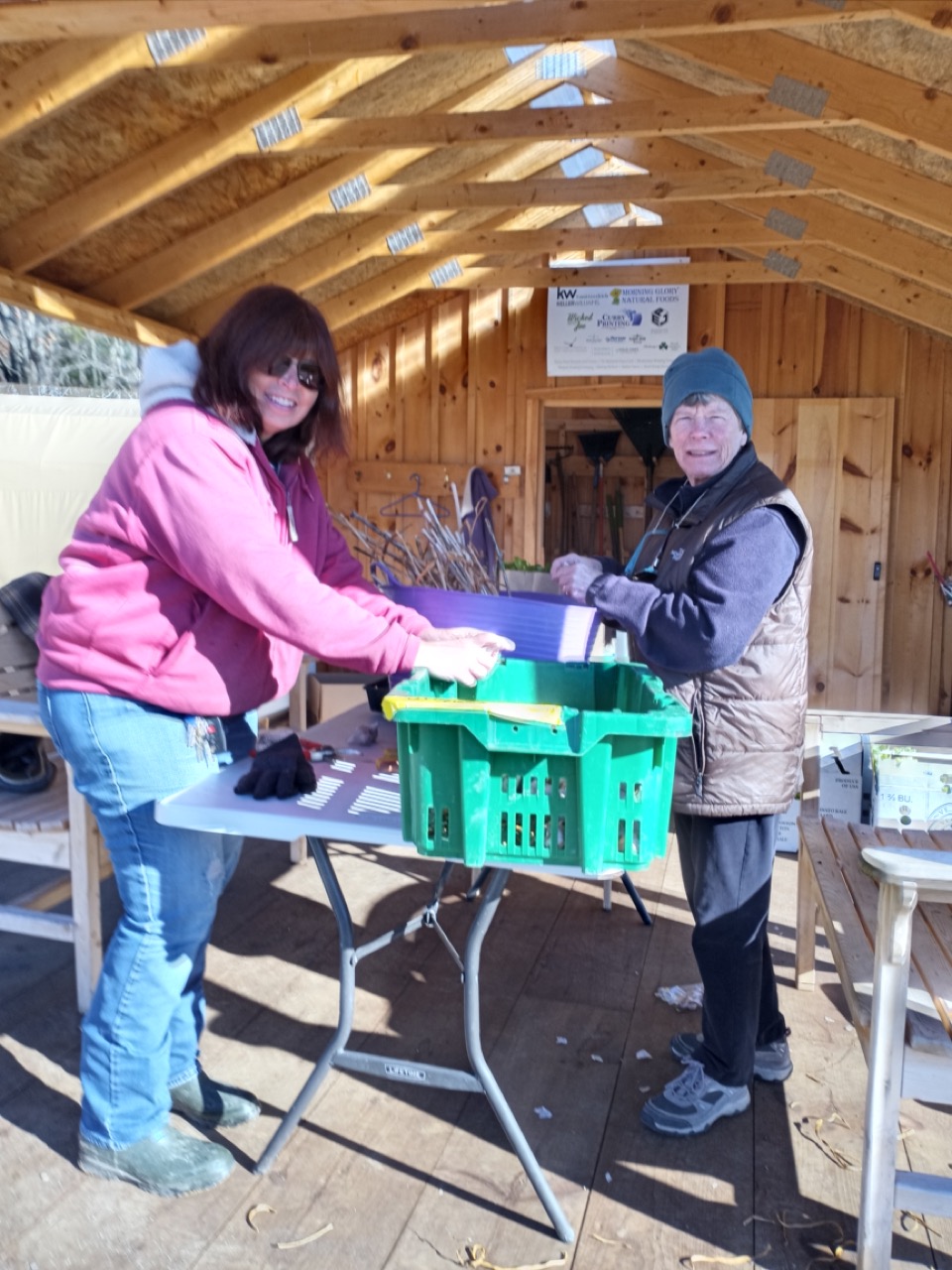 Friday was still a busy day with end of the season fix-it chores to accomplish. Carol brought her grandson, Ethan, and his friend, Brook, who helped weed and broadfork a final plot. We are so far ahead for next year, we were even doing some sprucing up of our ornamental areas like the willow hedge. Carrie was busy adding some more clips to the scissor doors. We are determined to beat the winter wind damage on our tunnel doors!
