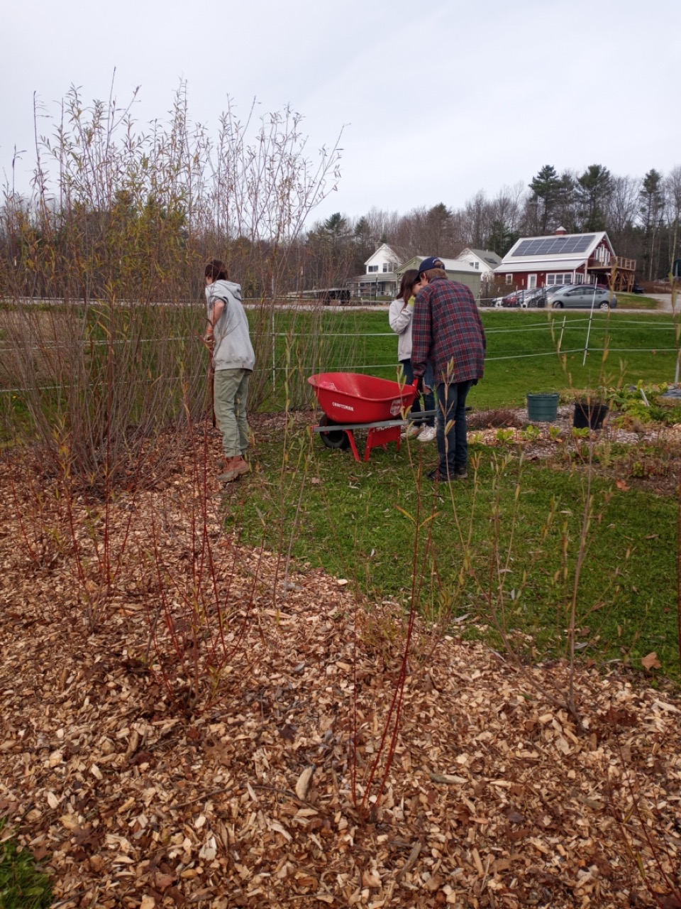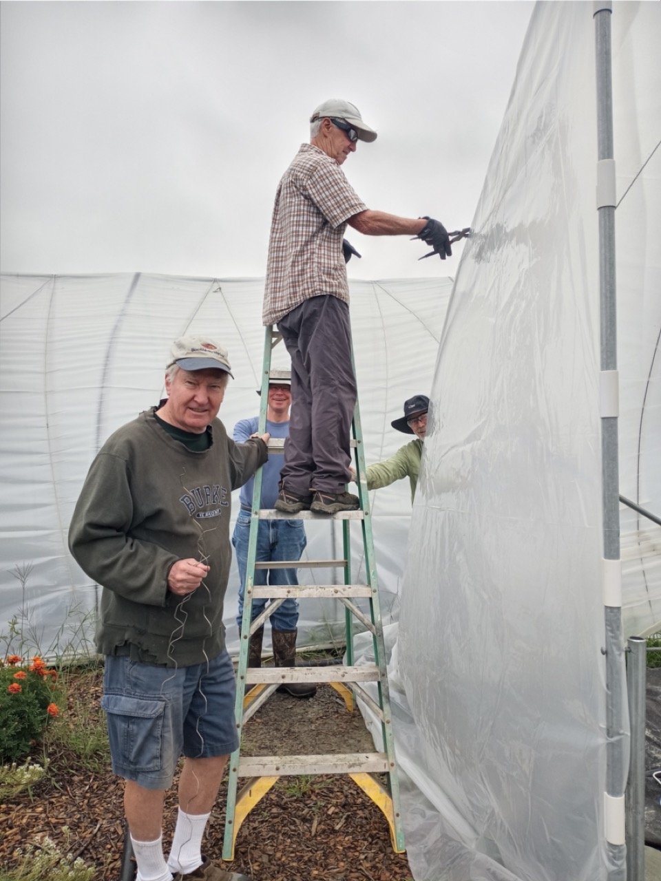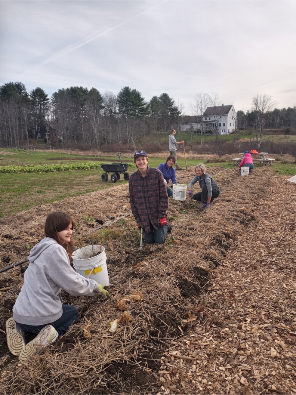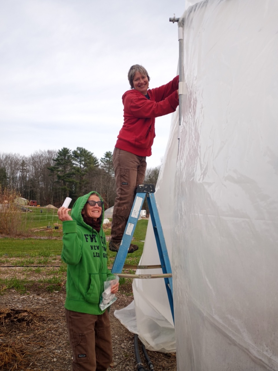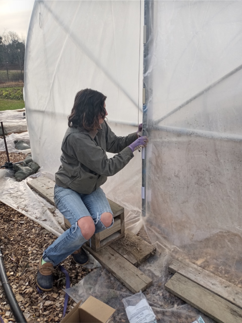 Friday was still a busy day with end of the season fix-it chores to accomplish. Carol brought her grandson, Ethan, and his friend, Brook, who helped weed and broadfork a final plot. We are so far ahead for next year, we were even doing some sprucing up of our ornamental areas like the willow hedge. Carrie was busy adding some more clips to the scissor doors. We are determined to beat the winter wind damage on our tunnel doors!
