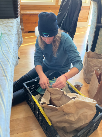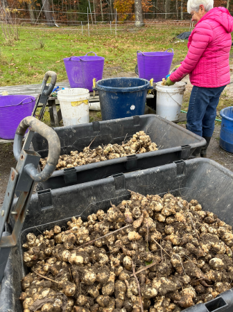 Amelia came on Monday to cart them all away and donate to the Wabanaki Community Food Pantries. They are feeding 200-300 people. Sunchokes are native plants and were originally cultivated by indigenous peoples. Lots of information about sunchokes on Wikipedia and the internet has plenty of recipes to try. Amelia tells me “soup” is the traditional recipe with corn and salt pork.