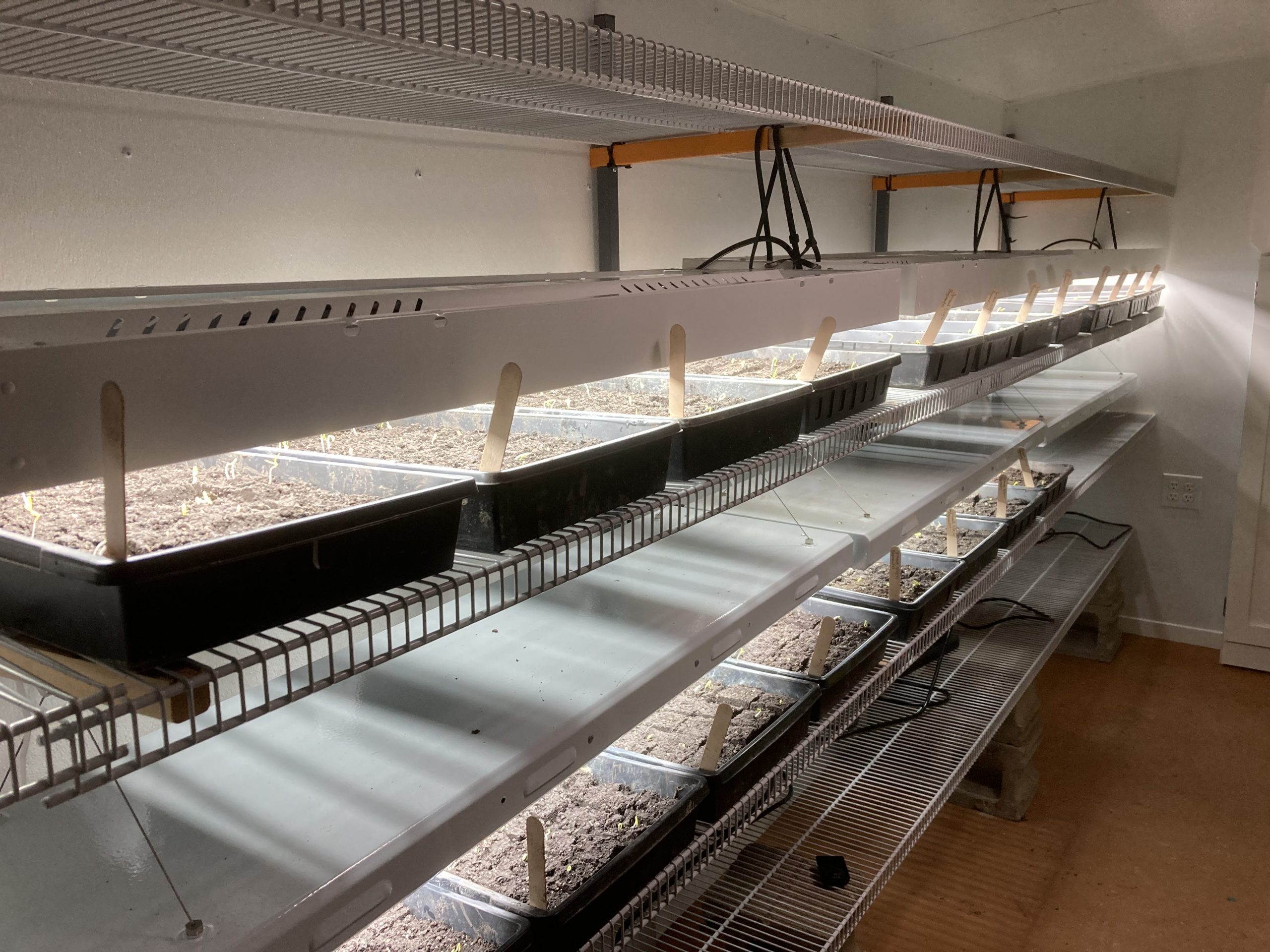 Tuesday with the help of three volunteers we started 1,000 multiplant soil blocks of spinach. These went into our new seedling/CoolBot trailer. Daily temperature checks by John have shown us it is working as it should and today our first spinach seedlings are emerging! Thursday brought Carrie to my house and we started over 7,000 onions, leeks, and seeds from last year’s bunching onion crop.