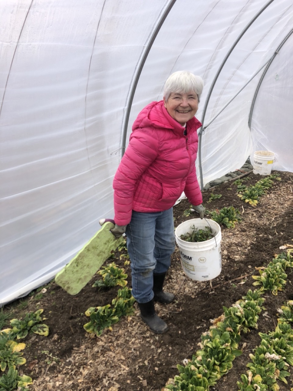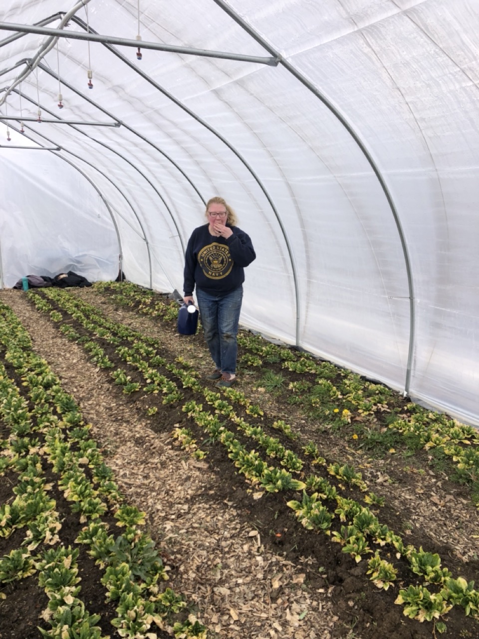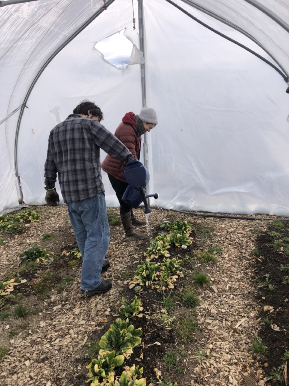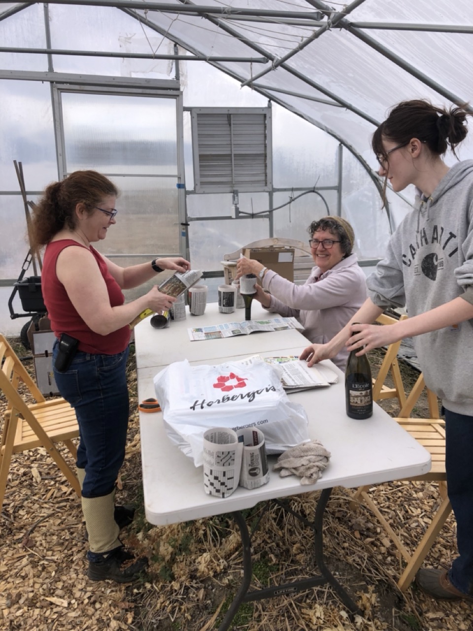 While volunteers rolled more paper pots, others finished weeding the entire spinach tunnel, which contains overwintered spinach from last fall. It will probably bolt before too long, but we hope to get a harvest out of it. It sure is tasty!