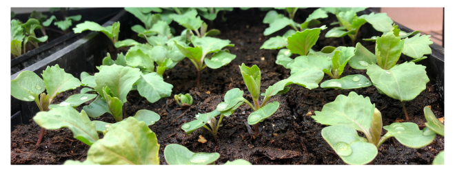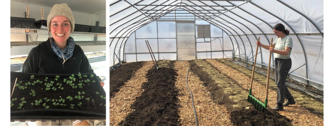 The Spring Equinox has come and gone, and though it is decidedly wintry as I write this, just last week it was 100F in the hoop houses! In the seedling trailer, newly sprouted storage onions, cabbage, and lettuces are bringing us joy and hope on these gray spring days. We can’t wait to have you all join us in tending to them as they grow! We have seeded salad radishes and turnips and some sugar snap peas in one of our hoop houses and tucked them in under frost cover for some extra warmth on these early spring days.