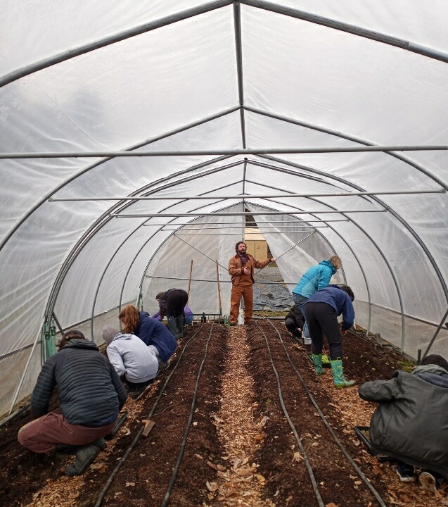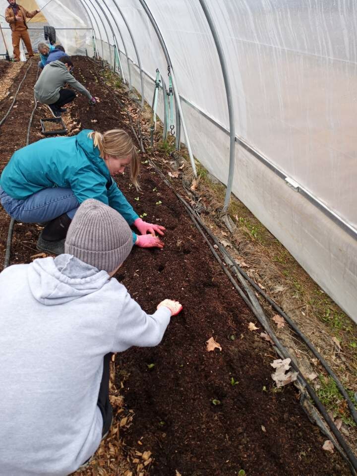 This week we were treated to a work song sing-a-long led by Ian Levitt, friend of the farm and accomplished musician. Riley, another friend of the farm and volunteer, organized 11 of her fellow Freeport High students to come and help us on Friday. It was another cold, rainy morning but everyone was cheerful and willing to do what we needed to accomplish, and boy did we get a lot accomplished! After a brief math calculation we determined that these students and their advisor Dede, planted almost 2,000 lettuce seedlings!