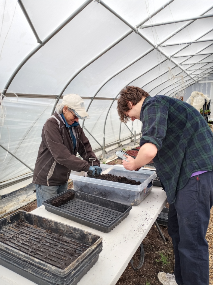 Starting and transplanting seedlings is an ongoing project this time of year. We have several volunteers who tackle this every week. B.J. is one of these volunteers, and this week she teamed up with Will. They cranked out 266 soil blocks of Capture cabbage, and it sounded from all the chatting that a new friendship was formed. That was the first time Will had come to the farm, and it looked like he was totally enjoying himself as B.J. taught him the fine art of soil block making. Our G2G volunteers are so welcoming to everyone, helping us to build such a strong community.