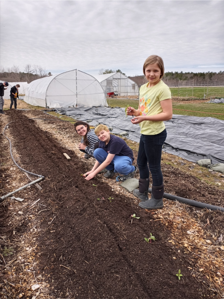 This week we had lots of kids on the farm again: big kids (our Bowdoin friends and a group of Colby students who are in the midst of a course on food justice), medium sized kids (Harpswell Coastal Academy students), and little kids (our neighbors down the road). All these “kids” helped us get another 720 lettuces planted in the beds and almost 500 Swiss chard plants into the ground.
