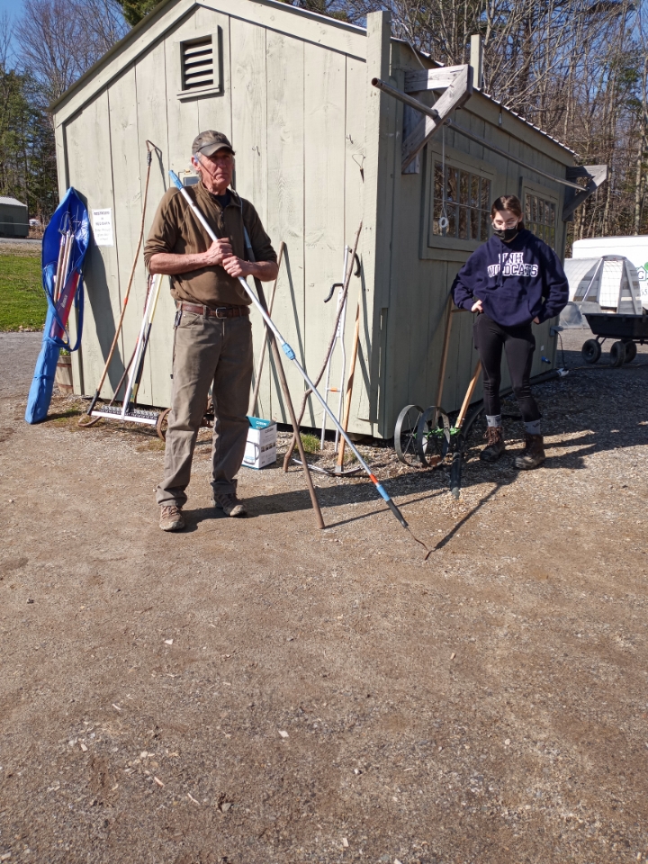 This was week 2 for the Farm Skills Training Team. We concentrated on “flipping” a bed for planting Swiss Chard seedlings. The broadfork was a new tool for most of them and was introduced just in time for our tool presentation by Jack Kertesz from MOFGA. Jack shared his love of creating tools from found objects. I especially liked the telescoping weeder handle made from an old painting tool. It was good for all of us to see how to save money by not buying off the rack. Jack also spoke about the ergonomics of tools and how designing your own tools to fit your body allows you to work longer and smarter. Thanks Jack!