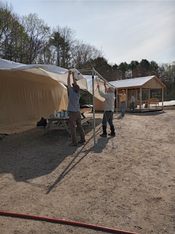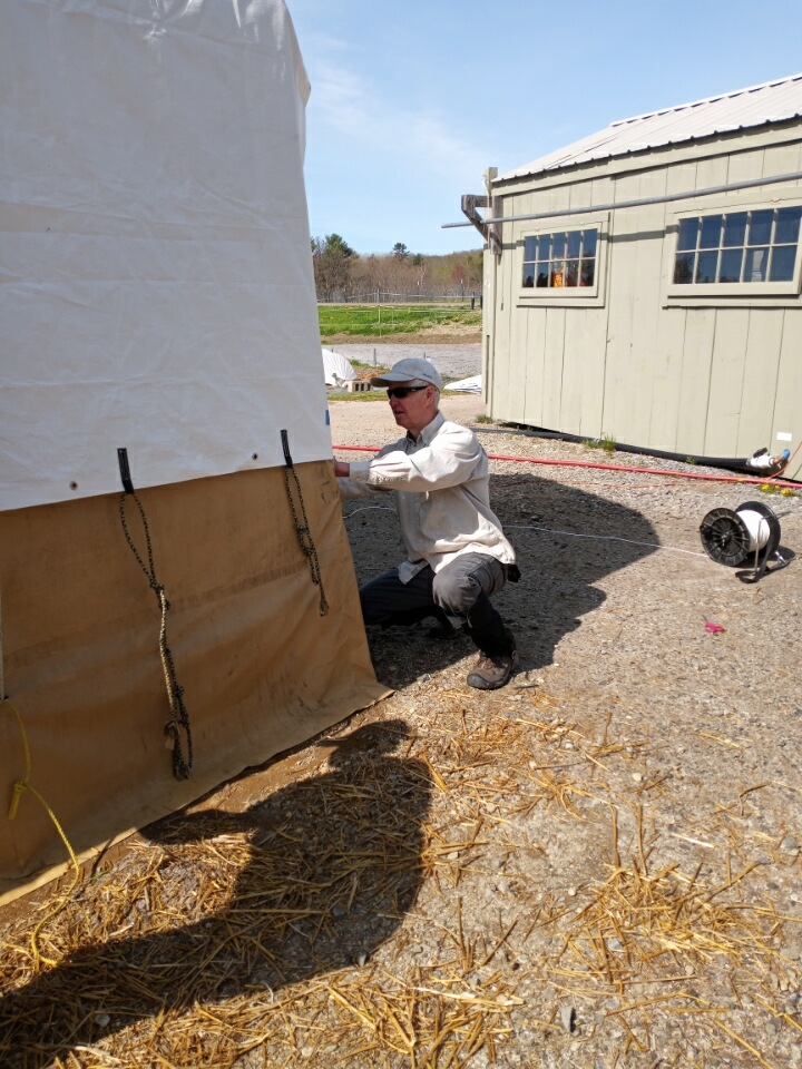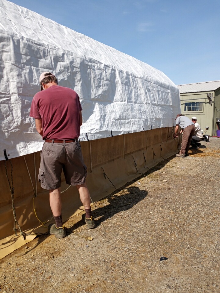 The Fix-It Team came to the rescue once again! Just in the nick of time our redesigned shade tarp was delivered and installed by the FAB 4–John Hayes, Tom, Diana, and Burnham. With John Newlin’s help it was pulled up over the tan shed and secured to the framework. Our hope is that the velcro straps John H. sewed on will be the solution to it shedding water and holding up in the winds.