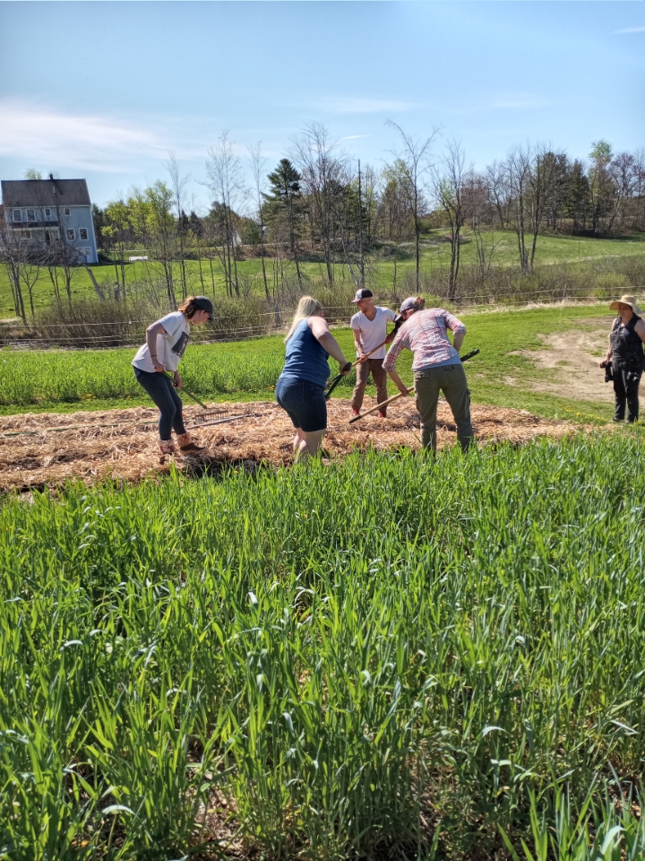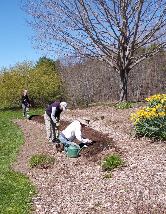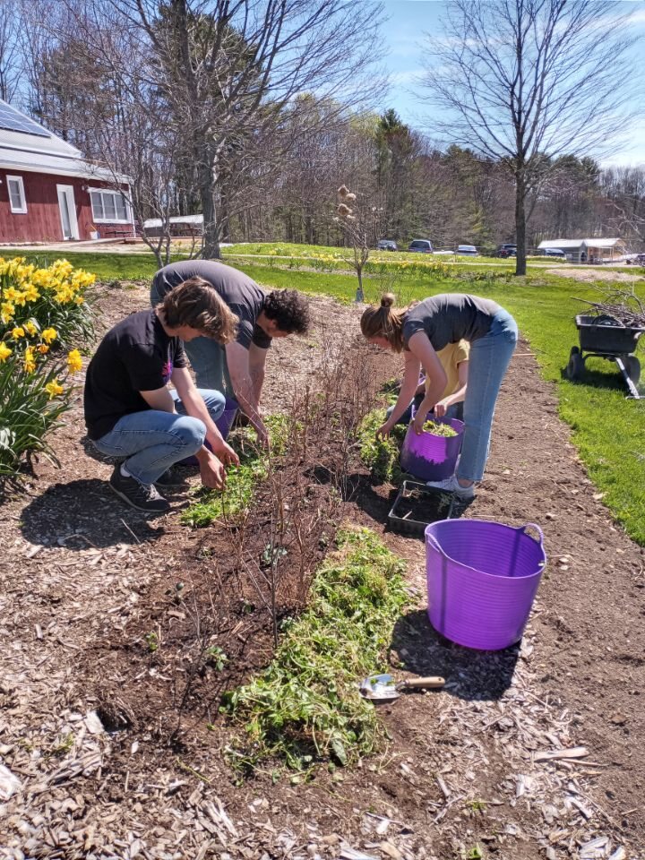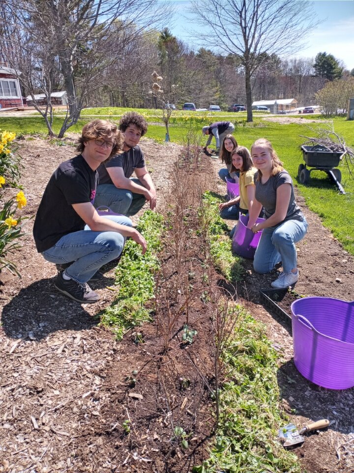 We also had a few of our high school friends from the Waldorf School come to help out. They cut back some clover for us to then use as a mulch around some newly planted snapdragons. Rebecca, Sharry, and Tina transplanted the annuals around some branches we had saved from prunings. The branches are to help the flowers remain upright for cutting–an idea I borrowed from a garden tour last summer on MDI.