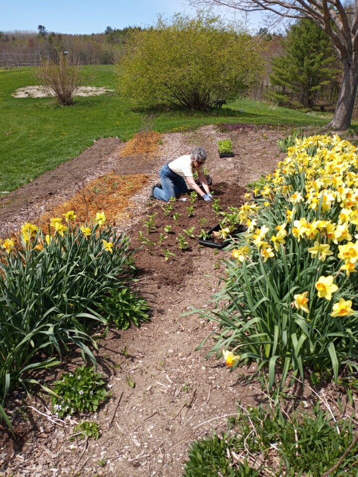 We are going ahead and transplanting our tender annuals out without protection. With no cool nights in the extended forecast, I might be taking a chance. I hope I’m not making a mistake! Diane worked on planting blocks of colors of zinnias. She is hoping to promote our Pick-Your-Own Bouquet for a donation in the community where she lives. Thank you, Diane.