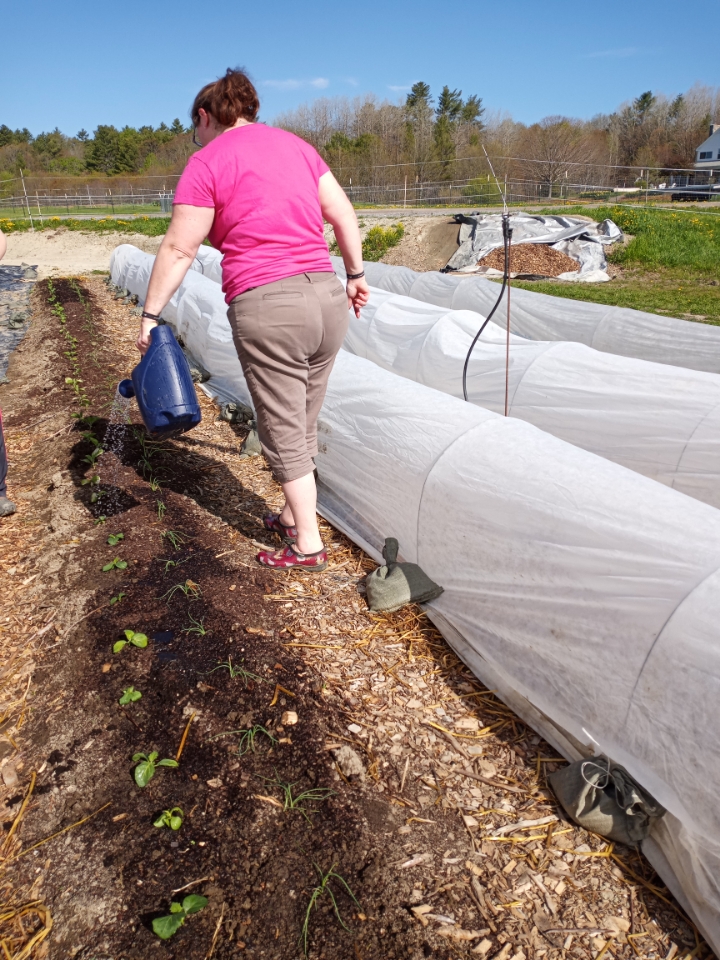 We started our week off with gleaning–Judy on Monday and Carol on Wednesday. Judy delivered spinach and rhubarb to Woodside in her home town of Lisbon Falls. Judy has such a big heart and is really invested in helping her neighbors in need. She knows from her conversations with these recipients how important these additions of fresh vegetables are to their lives. They never let anything go to waste by freezing or drying anything that is left on their community table.
