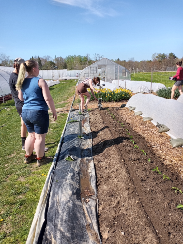 Interplantings of beets with the peppers was done by Logan using the Earthway seeder. Amy was watering in the eggplant, onions, and a sprinkling of dill. Dill is supposed to attract beneficial insects who would prey on the CO potato beetle if the need arises.