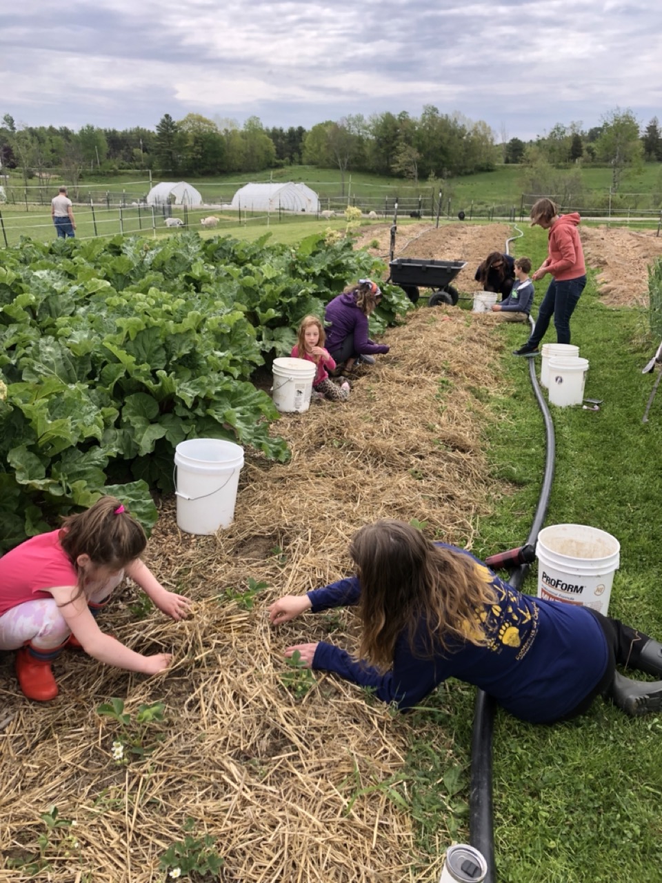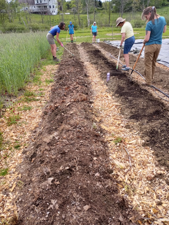 Our new triangle-shaped flower beds in the upper field were mulched on Thursday by a home school group and their parents that meet regularly at Patten Free Library. They also weeded our strawberries. It is always fun to find projects that will engage people of all ages!