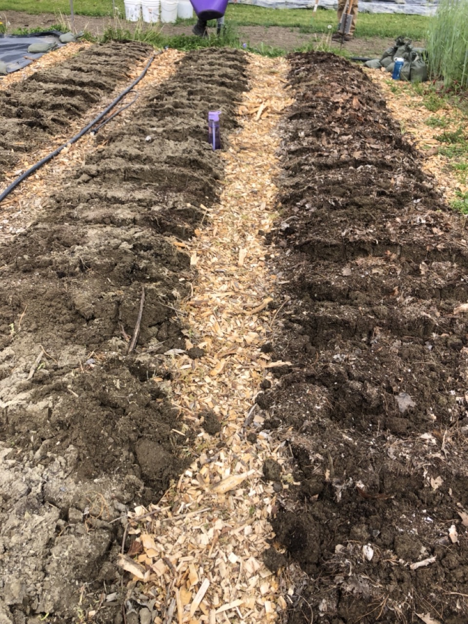 We turned some new beds on Saturday and interplanted amaranth, white eggplant, Thai basil, nasturtiums, alyssum, and celosia. This should be a burst of color! Some of these plants are part of our culturally preferred requests. Mother nature dropped ½ inch of rain later that afternoon, which hopefully will give them all a good start. The beds in this plot were visibly different in how they were treated last fall. The beds that were finished off with leaf mulch have a darker soil color and were less compacted and dense. It will be interesting to observe the differences in plant growth and health. We do love our leaf mulch. The mulching we have been doing all season with straw has saved us from this dry weather. The plants are looking healthy and seem to be insect-free.