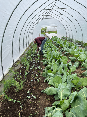 Saturday brought lots and lots of rain. We decided it was time to start rescuing the cabbages from their shrouds of row cover. Warmer temperatures are coming, and we don’t want them to cook. Riley is showing the before, Mary the work in progress, and David was left to finish up.