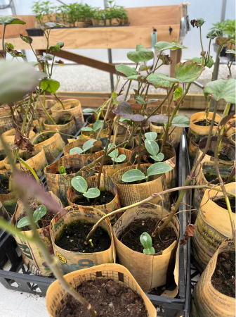 Someone forgot to label these pots as cucumbers so when our sweet potato slips came in and needed to be held for a bit, they went right in these soil-filled pots! Sorry cucumber seedlings, sweet potatoes get priority in this case.