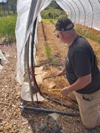 Alyson and Henry came to help this week. We gave them one of the least rewarding jobs to tackle–weed suppression along the sides of the tunnels. Cardboard cut-outs topped with wood chips is our solution, and they finished an entire side. Thanks for coming from Portland, you guys, and spending some of your summer vacation time at Growing to Give.