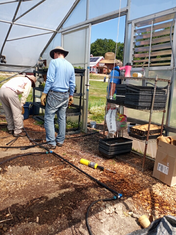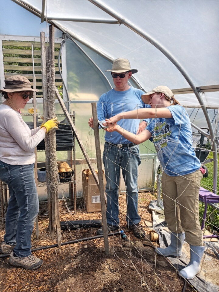 The Fix-It Team was barely finished setting up the soaker hoses and tightening all the leaks in the Rimol greenhouse when we were right behind them with broadforks, compost, and a trellis. We are eager to get this greenhouse planted!