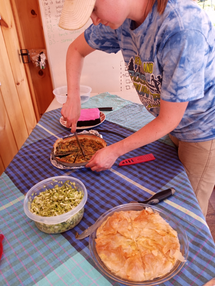 Our potluck this week had a theme of “what’s on the farm”. There were just 4 of us this week, but we managed to include cabbage, chard, onions, beets, herbs, and CAKE! Okay so that is technically not what is growing on the farm, but those of you who know me know that chocolate cake is an essential food group. Everyone brought something delicious and special to share….but Sophia brought a beet cake! I want to point out that all our interns are living in situations not conducive to cooking/baking. They go to extreme measures under adverse conditions to contribute to our Friday potlucks. Again, Sophia brought cake! Not only did I have a piece at lunch, she allowed me to bring a piece home! Okay enough about cake….or can there be enough?