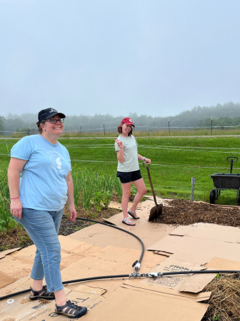 On Saturday, our friend Brigitta came by to volunteer. She and Libby finished wrapping the blueberries. Mary and Amy were laying cardboard for weed suppression, while giving me their best faces? Wendy, Karin, and Andrew helped uncover more plots of squash. Thanks, gang.