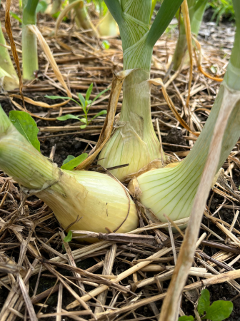Carrie asked me how the garlic looked. “Not so great–kind of small,” I said, disappointed. She walked out to the garlic plot, pulled a couple, and responded with, “We’re not totally doomed!” So we added green garlic to our recipients boxes.