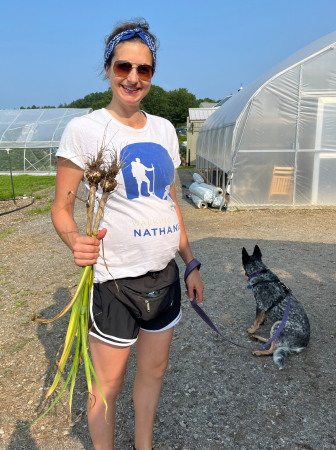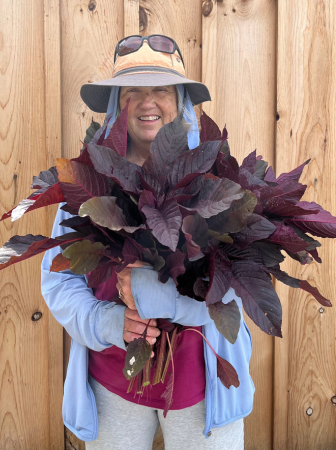 Fridays are always fast and furious. Amanda was teaching an early morning yoga class up in the yoga studio, Ryan harvested scallions, Sharon was on beet greens, Peg was hunting for cucumbers, I was cutting back the amaranth to increase production, the interns had picked lots of flowers for bouquet making, bouquets were made, the Fixers were replacing an end wall, Bob was sharpening all our pruners, Libby was weighing and distributing the produce, Becky and Dylan were rescuing the elderberries in our lower field, volunteers were weeding, and then it was time for Friday potluck! (Sorry for the run-on sentence, but I had to get it all in there.) It was another delicious lunch, shared and enjoyed by all! This week’s theme was Mediterranean. Next week is something that is currently being harvested at the farm. Anyone can join us!