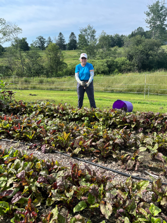 Fridays are always fast and furious. Amanda was teaching an early morning yoga class up in the yoga studio, Ryan harvested scallions, Sharon was on beet greens, Peg was hunting for cucumbers, I was cutting back the amaranth to increase production, the interns had picked lots of flowers for bouquet making, bouquets were made, the Fixers were replacing an end wall, Bob was sharpening all our pruners, Libby was weighing and distributing the produce, Becky and Dylan were rescuing the elderberries in our lower field, volunteers were weeding, and then it was time for Friday potluck! (Sorry for the run-on sentence, but I had to get it all in there.) It was another delicious lunch, shared and enjoyed by all! This week’s theme was Mediterranean. Next week is something that is currently being harvested at the farm. Anyone can join us!