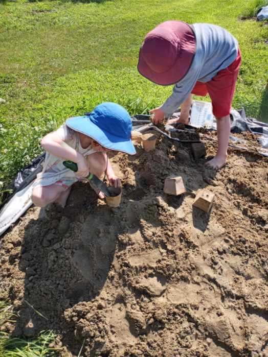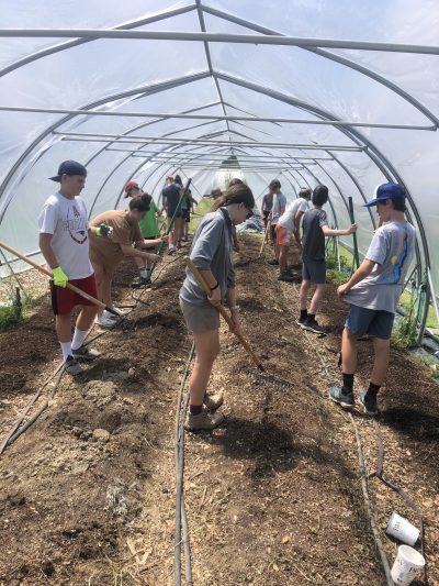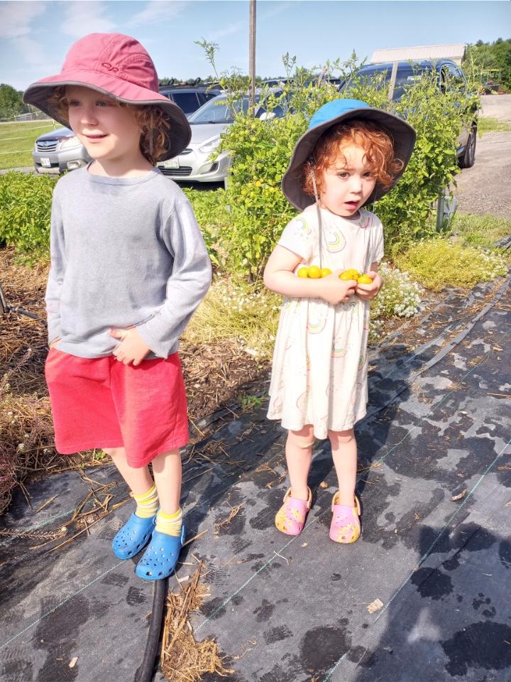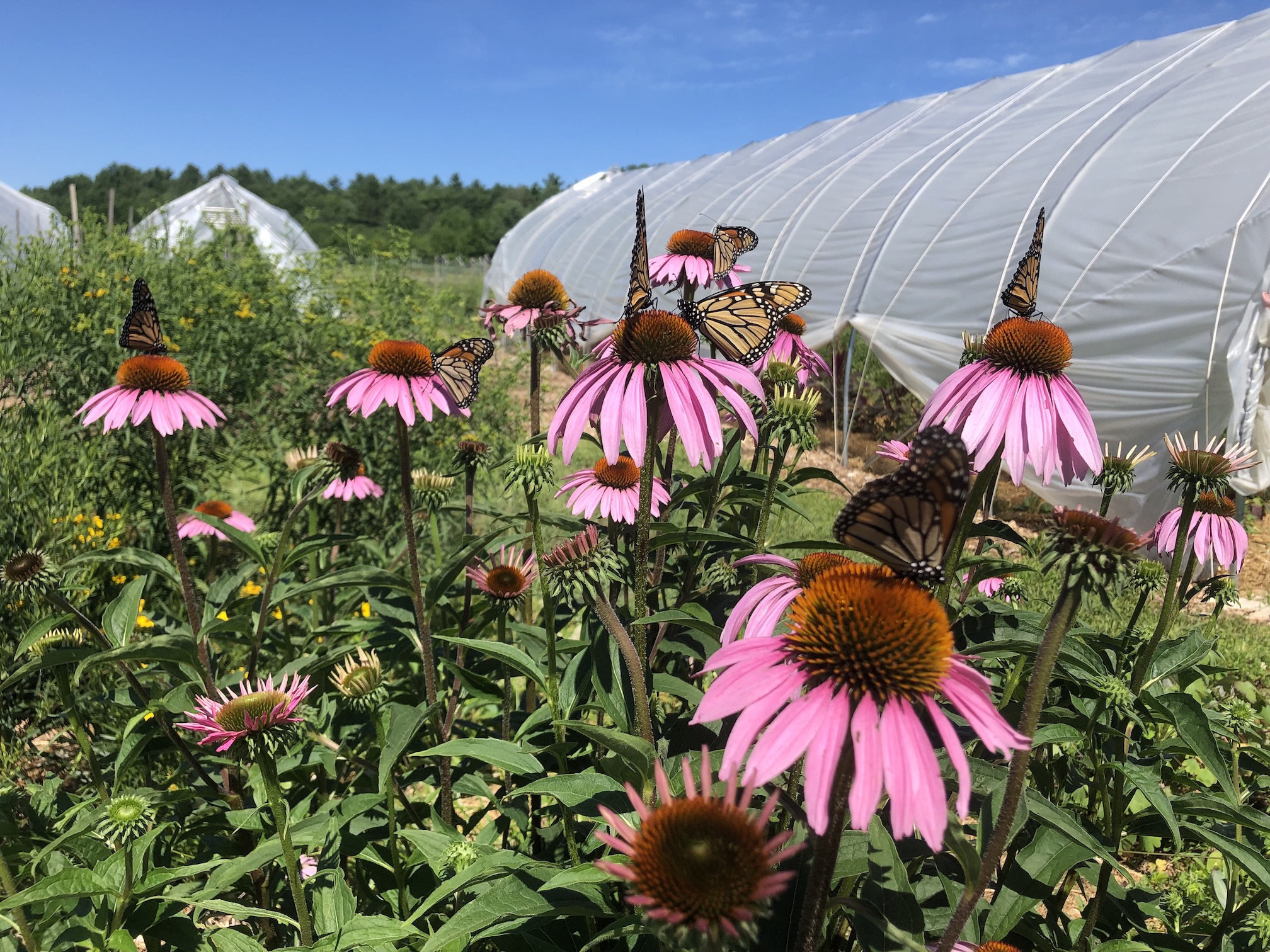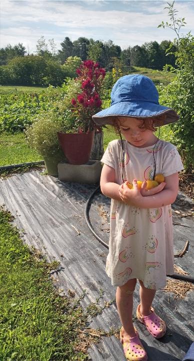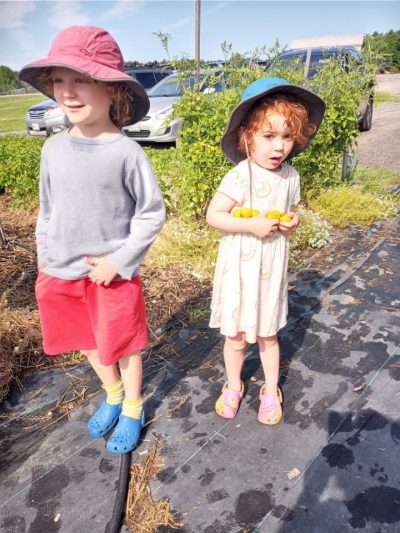 Diana and Judy worked in the greenhouse training our late cucumber planting to climb up the strings. Carolyn and her team of gleaners came to harvest, and Vera officially opened the cherry tomato snack bar. All I had to say to her and Finn was that the snack bar was open, and they knew exactly what that meant. Finn does not like to eat cherry tomatoes, but he does like to overload his sister with what he picks. Vera ate all of them! Later they emptied broken sand bags into a pile for me, then spent some time building sand castles. Finn later led an expedition out to the beneficial hedgerow and identified all the butterflies, hummingbird moths, and hummingbirds for us adults. As Carrie remarked, “the hedgerow is doing what it was designed to do.” Nice job, Carrie–your design is beautiful in all seasons. With all the milkweed in the hay fields and nectar sources throughout the farm, I am wondering if we could apply to be a MONARCH WAYSTATION. We will have to look into the possibility.