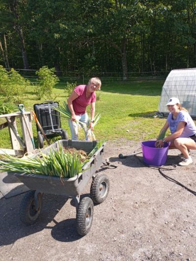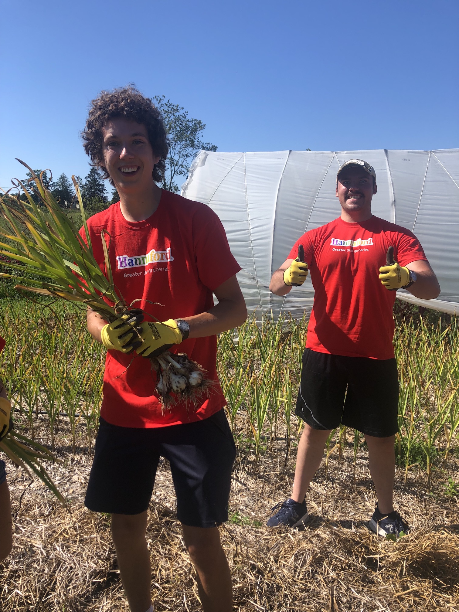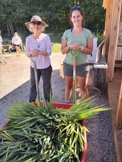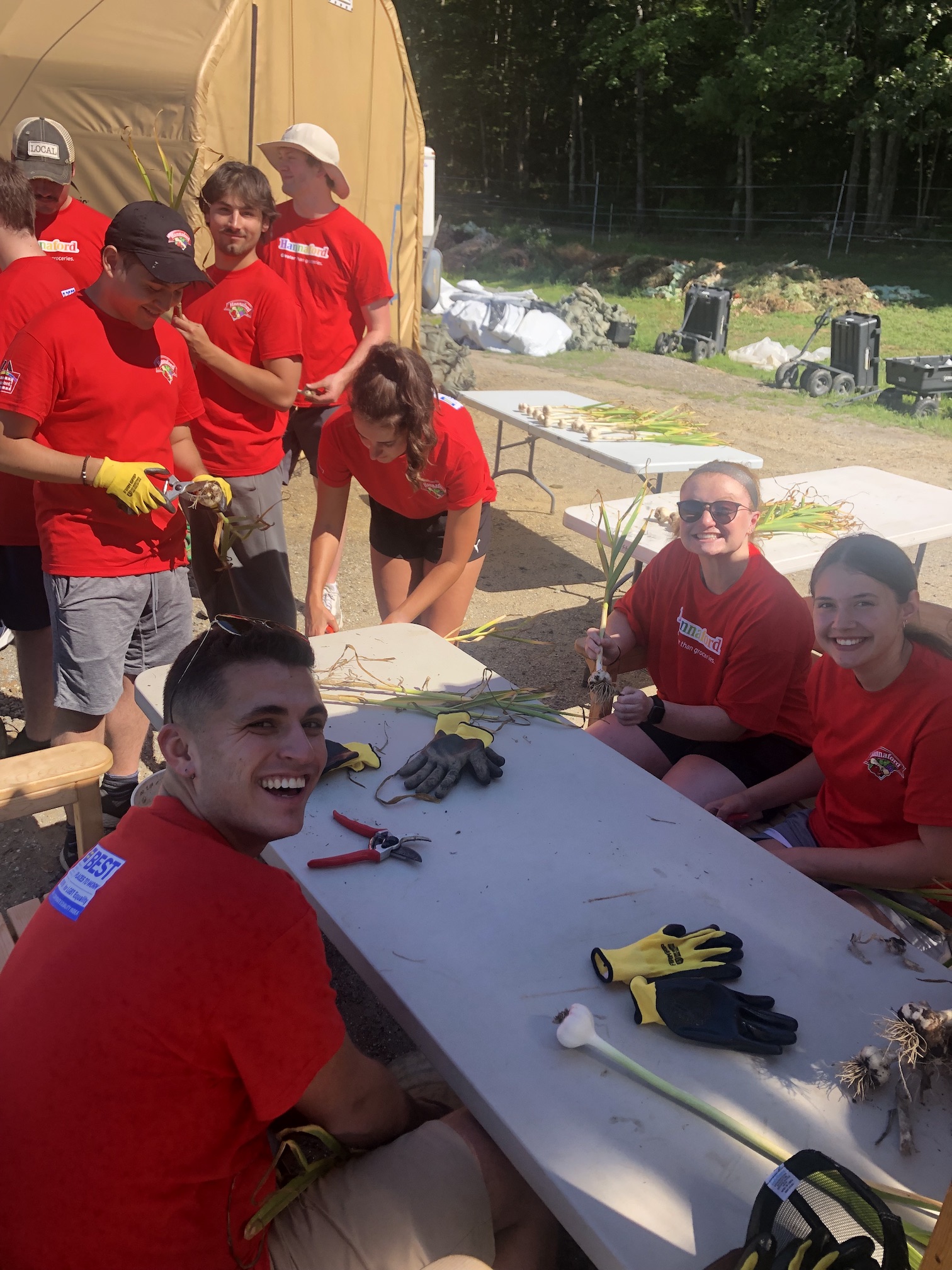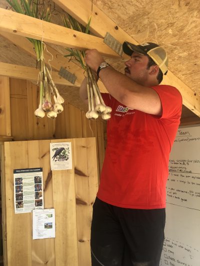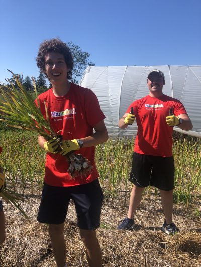 We had our annual group of Hannaford interns come on Thursday. 15 of them arrived just in time for our garlic harvest. They pulled, weighed, cleaned, and hung our entire plot of Music garlic. The garlic was sorted for seed garlic, donation garlic, and garlic that will be available for sale by donation. This was such a huge help. A project that would usually take us a couple of days to accomplish was completed in just a few hours. Always a positive, energetic group when they arrive at the farm, and they left us with a donation of garden gloves. Thanks to the interns and Hannaford!