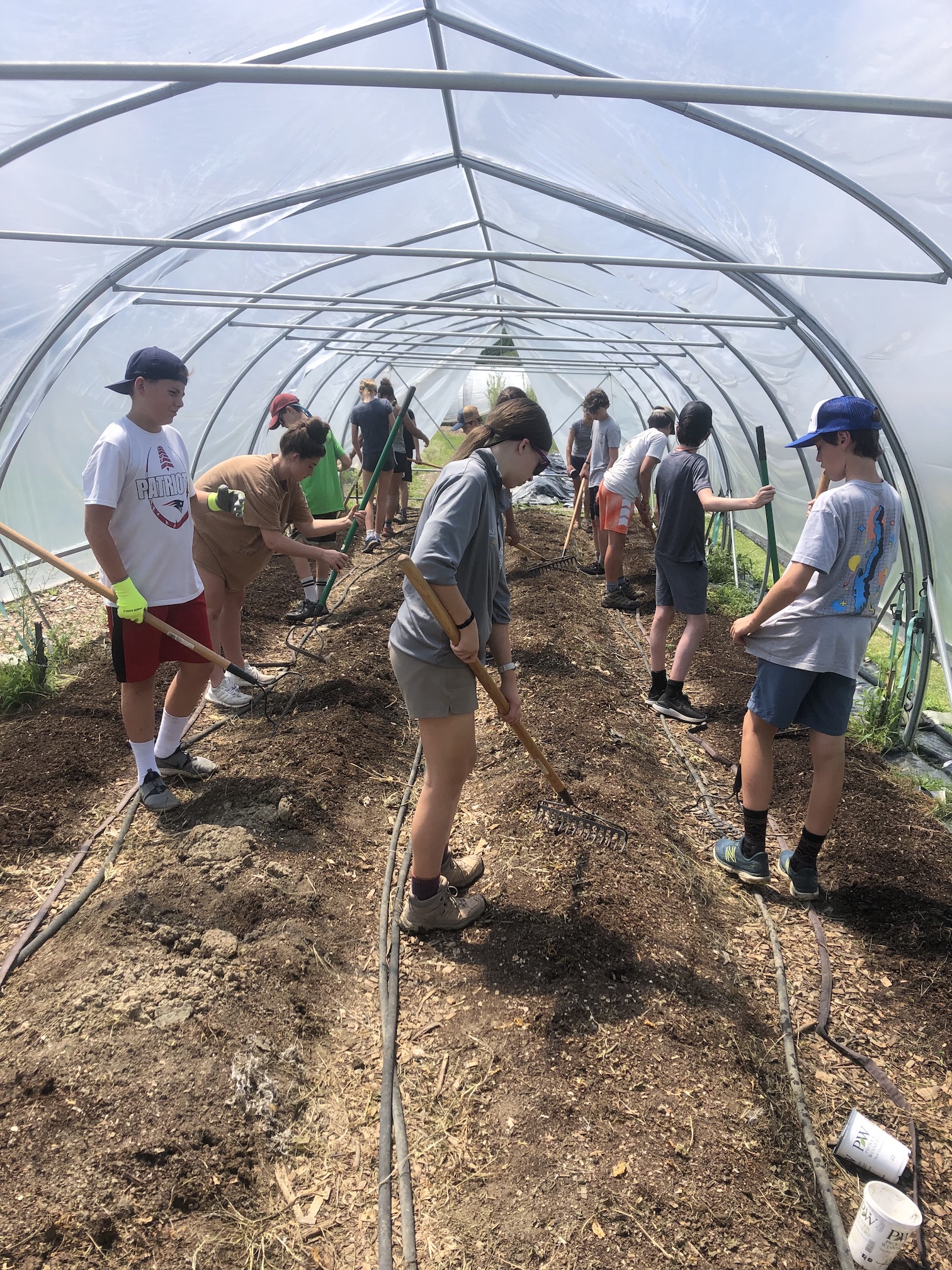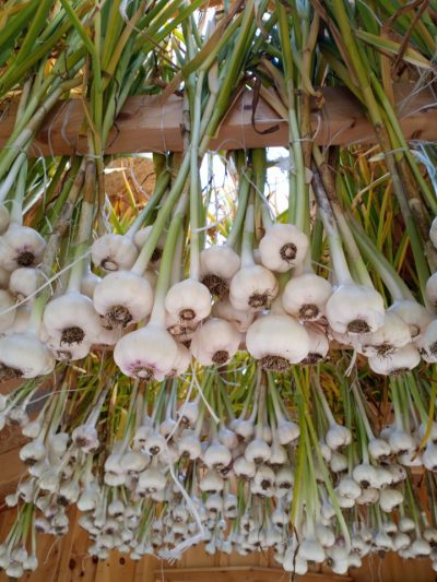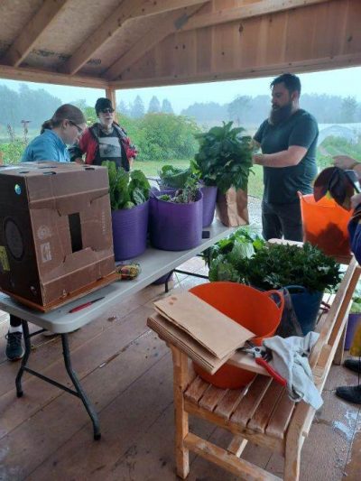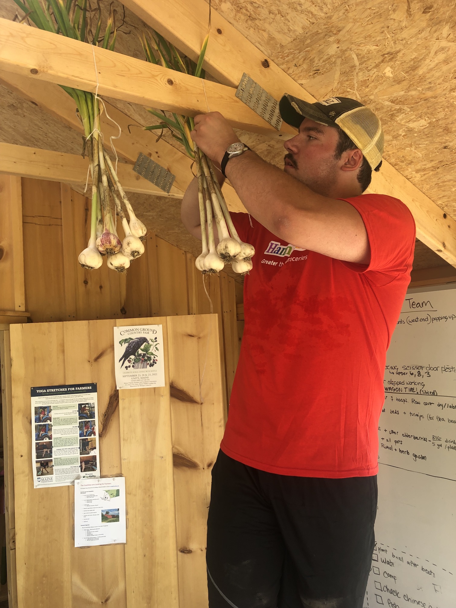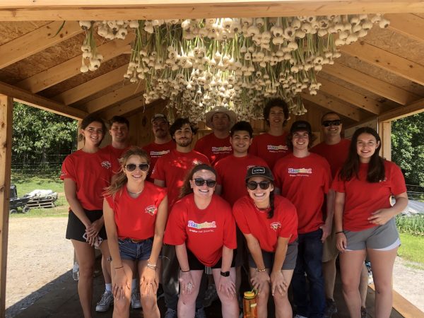 We had our annual group of Hannaford interns come on Thursday. 15 of them arrived just in time for our garlic harvest. They pulled, weighed, cleaned, and hung our entire plot of Music garlic. The garlic was sorted for seed garlic, donation garlic, and garlic that will be available for sale by donation. This was such a huge help. A project that would usually take us a couple of days to accomplish was completed in just a few hours. Always a positive, energetic group when they arrive at the farm, and they left us with a donation of garden gloves. Thanks to the interns and Hannaford!