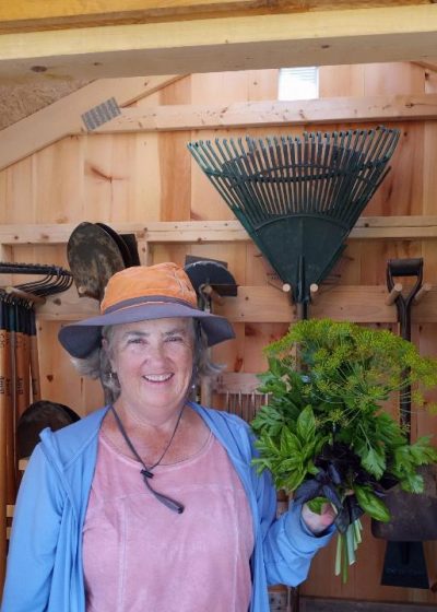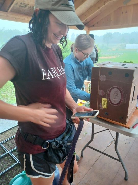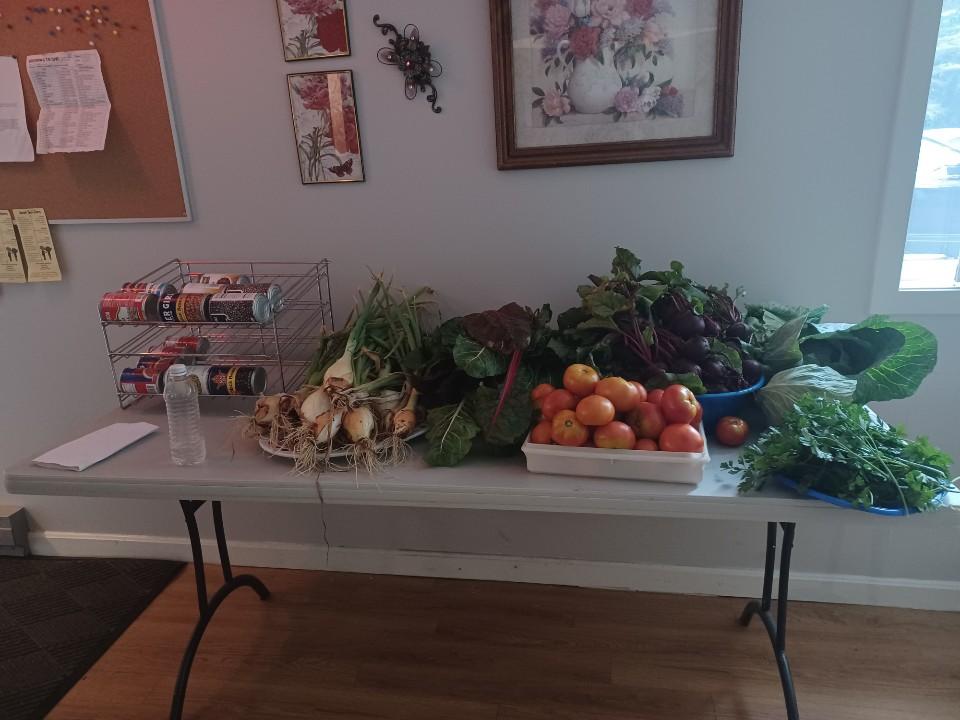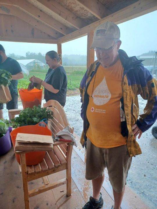 Well, not sure about gloom of night, but we have harvested in the other 3 conditions and Monday was a true test of our team and our Monday gleaners. The skies opened up and dumped on everyone. Here are some photos showing everyone totally drenched as they packed up the boxes for delivery. They persevered and harvested almost 300 pounds that were donated. When Judy drops off the donations at Woodside, they are artfully arranged for the residents to shop at their very own farmers market. This is such a lovely gesture of appreciation.