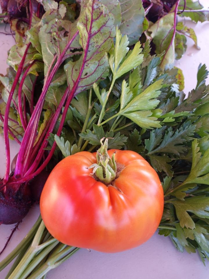 Wednesday, Dina and Sarah harvested wheelbarrow loads of bunching onions as Sophia and Annie started planting the 1,800 more bunching onion seedlings for a September harvest. Peppers, beets, tomatoes, cabbage, chard, and lots of beautiful fresh herbs also went out for donation with this Wednesday gleaning.