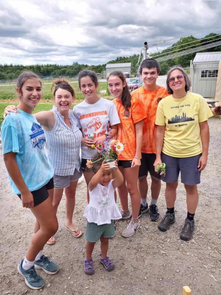 Saturday brought another group of young people. Six volunteers from Holy Family Parish came and helped finish off the bunching onion project in the very hot sun. I promised a shady seed starting project next, which sounded good to everyone. Genevieve has become a master at making soil blocks and does a great job giving instructions to our new volunteers. Under her guidance over 500 Napa cabbage seedlings were started for planting and a Fall harvest. Darcy wanted to help, but wasn’t quite sure what to do, so she fed the goats and picked flowers instead.