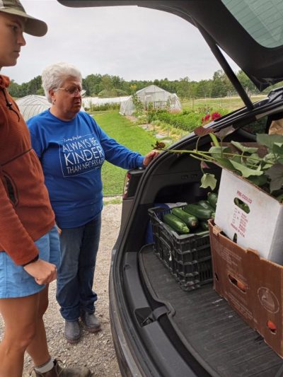 On Wednesday, Julia came with a team to glean, and we sent out 791.77 pounds to 8 different locations. Abigail came with her sons, Henry and Jacob.They were a great help in the zucchini plots. The poundage of zucchini alone was over 200 pounds. My favorite moment of the day was when Henry asked his mom if they could come back again to help before they left for their home in New York. This is part of what we are so happy to do–giving experiences to young people on how food is grown, harvested, and donated. We loaded up their minivan and sent them off on a delivery! Everyone’s vehicles were maxed out with boxes. Deidra was contemplating how to get more into her Tesla so Julia would not have to make two trips. When you run out of space in your trunk, there’s always the Tesla “front trunk”! Is that a term?