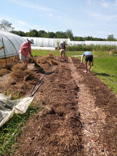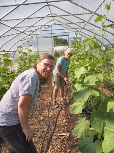 We had 13 volunteers on Saturday–harvesting tomatoes, working in the Rimol, trailing and suckering cucumbers, deadheading flowers, prepping a bed for a cover crop planting, fixing irrigation issues, and watering. There is always something to do. When asked if we might have a volunteering opportunity for someone who has a disability, I say of course! I always tell people our volunteers are 3 to 93, and there is always a task or project that everyone can be a part of.