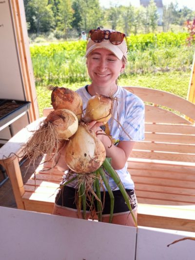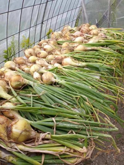 Then came Tuesday. We decided this was onion harvest day for tunnel 8. Claire’s project for the summer was tracking the weights of produce in our Upper Field and comparing them with the amounts of biochar in those beds. She has already done this with the harvested garlic. Claire brought along her Mom (Heather), and we headed out to the tunnel no one wants to go in. Why you might ask? Well, it was “abandoned” by us after the lettuce was harvested. My story is there was too much to keep up with elsewhere on the farm, so being the last tunnel furthest from view, out of sight out of…. It was just scary in there! So that takes us to Tuesday morning. Armed with carts and harvest buckets, we pulled out 586.92 pounds of onions! Luckily, Wendi came to help us, and it took about two hours to harvest and weigh all those alliums. The variety was Ailsa Craig, which can get up to 5 pounds each. Our largest onion was 2 pounds. I cannot imagine a 5 pound onion! So here are photos showing just part of our bounty. This table of onions is holding what came from bed 1, and we had 4 beds! Now there are onions everywhere!