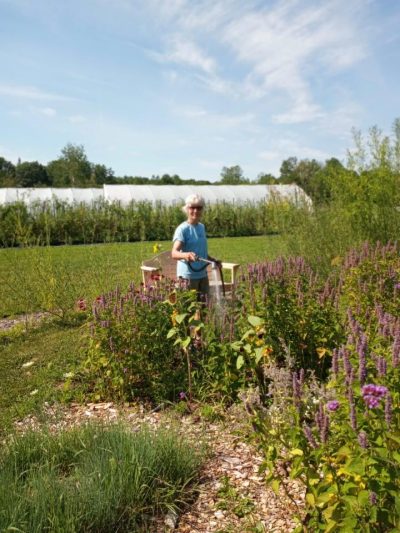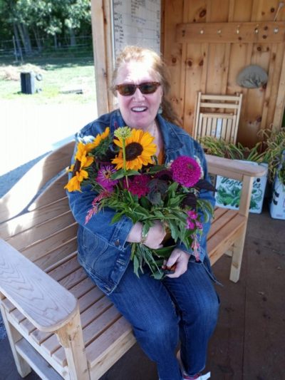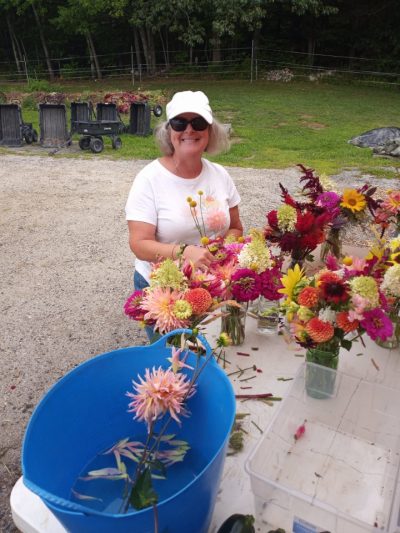 On Friday we had what is now called a “Theda”. A member of our mowing team ran over and sliced open one of our main irrigation pipes. I put out a call for help, and, on Saturday, Burnham came to get it back up and running. Thank you, Burnham. Even with that inch of rain we got last week, we are watering daily. Our friend Mary came and made and delivered lovely bouquets to Morning Glory. They are available to buy for a donation. Elizabeth stopped by and picked her own lovely bouquet.