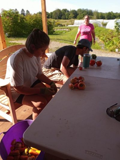 There was another big tomato harvest on Friday. All the field tomatoes have to be picked underripe due to our friends The Crows. We then sort them to hold for ripening at the farm. Eliot was helping with this assignment. He also helped me pack and sort out the boxes for distribution. After calling him Ethan all morning, he finally told me his name was Eliot. 🙁 Sorry Eliot, but thanks for being such a great help! We sent out 431.72 pounds on Friday and again filled all the gleaners’ cars to the max! This week’s total was 1,573.20 lbs.